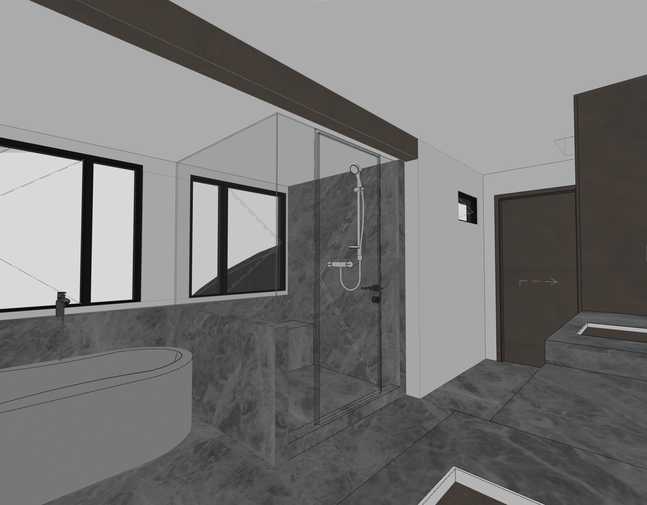 grigio toscana marble tile and slab whitewashed oak cabinets doors and beam gunmetal matte plumbing fixtures plaster walls