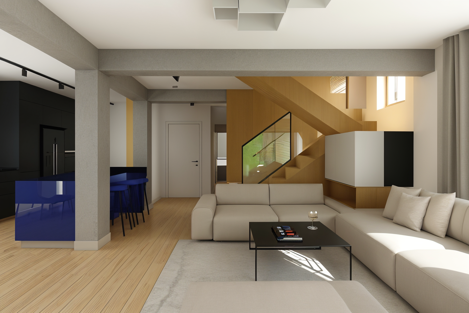 modernist interior shot change floor tiles to cream but leave the rest of the cabinets to deep blue color architecture
