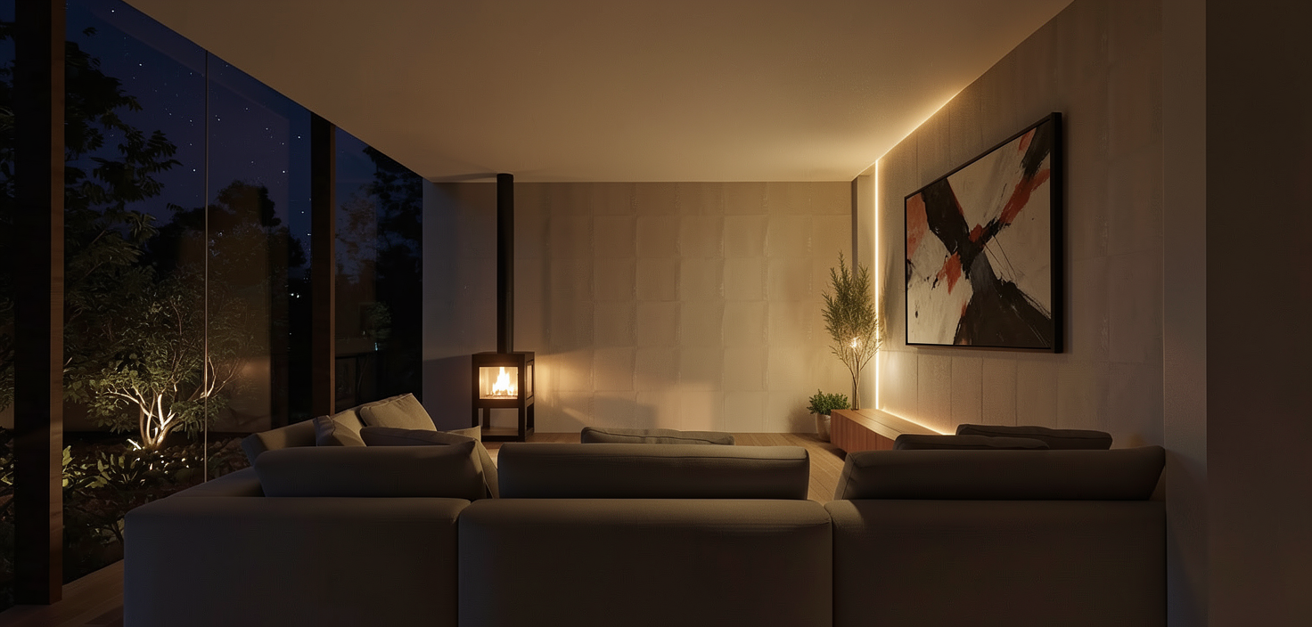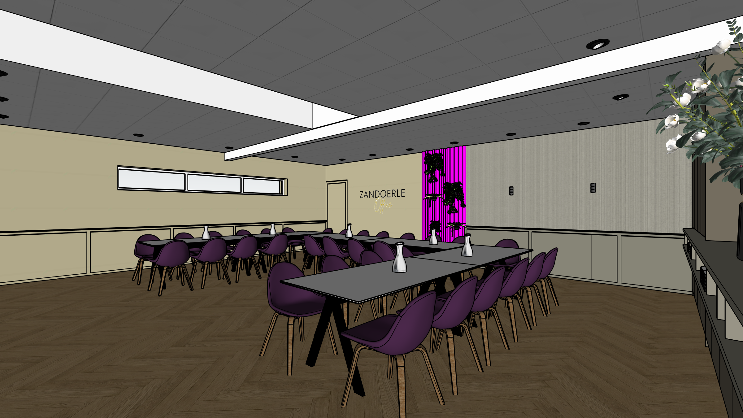 transform the provided meeting room interior image into a high end photorealistic render with a refined luxury hotel chic atmosphere warm elegant lighting and premium material realism while keeping everything exactly the same same geometry same proportions same furniture positions same ceiling layout same wall divisions and same spatial configuration do not move or alter any objects or architectural elements only render and enhance the elements that are visible in this specific camera view do not invent reveal or add objects that are not visible from this angle all tables and chairs must remain in their exact locations and proportions the chair legs should read as light oak wood with realistic grain and a soft satin finish the table bases should appear matte black metal and the table tops should read as clean white solid surface with subtle reflections without changing shape or dimensions chair upholstery remains the same deep aubergine tone but rendered with realistic fabric texture material adjustments any visible vertical slatted columns should appear as elegant brushed bronze metal with warm reflections while keeping their exact shape and spacing unchanged any visible wallpaper next to these columns with paneling below should read as vescom palena 1070 17 the paneling lambrisering must keep the exact same color tone as in the original design only rendered realistically all other visible walls should read as little greene portland stone deep with realistic painted depth the cabinet on the right should read as little greene attic ii with a refined matte lacquer finish the vase with floral arrangement may be partially visible with more green and should remain correctly cropped by the camera view do not reposition or reveal more than shown add subtle meeting styling on the visible tables only a few premium notebooks pens and glass water carafes with drinking glasses minimal refined and without clutter lighting should be turned on throughout the visible space including wall lights creating warm ambient illumination soft shadows gentle highlights and a sophisticated hospitality atmosphere if the door is not visible in this view do not add or generate one only add a door handle if a door is actually visible enhance realism through accurate wood grain fabric upholstery texture bronze reflections painted wall depth and polished material clarity while preserving the entire original design exactly as provided and respecting the camera perspective