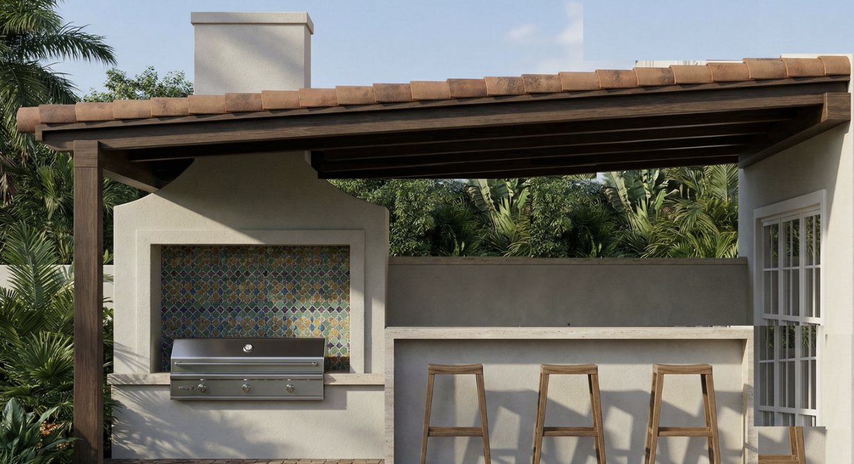 add fairy lights under roof make building stucco a pale yellow add bouganvilla vines on the front of the opening