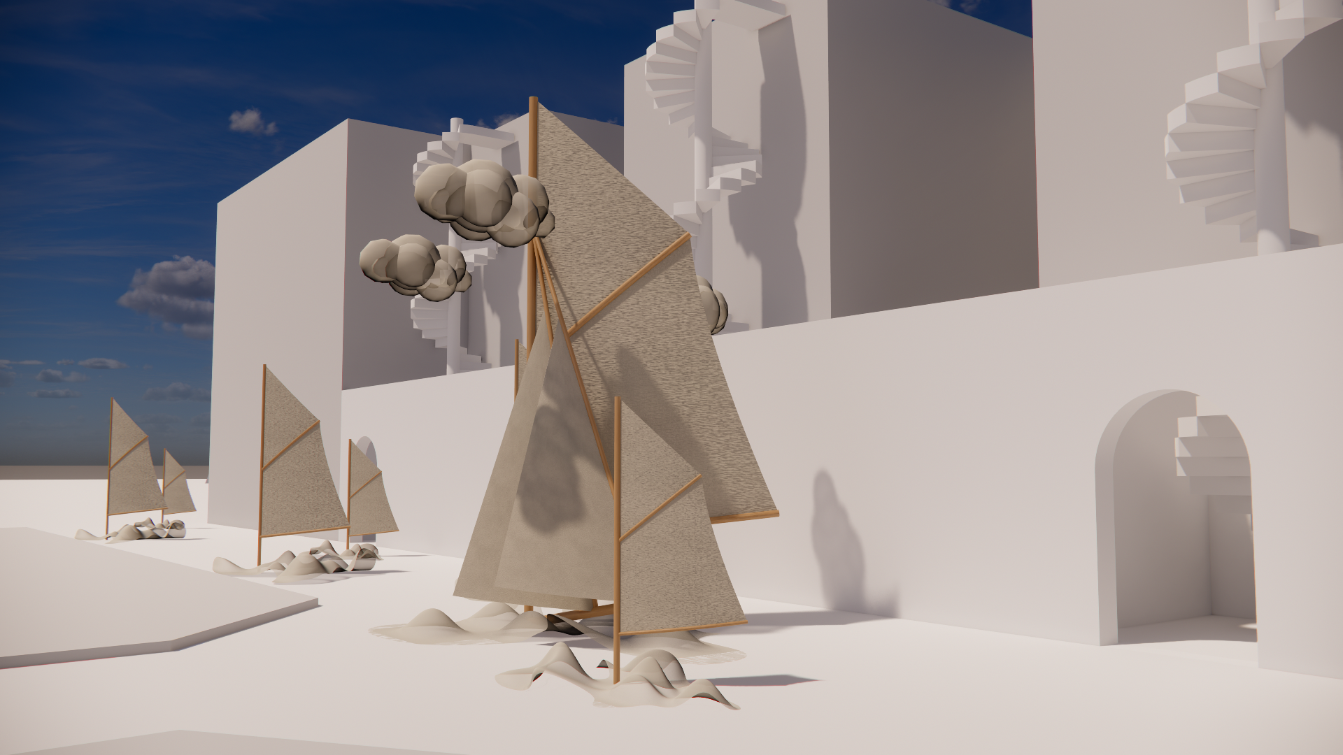 an elevation of an outdoor light and shadow art installation in singapore a white fabric scaffolding covers the back wall phinisi sail masts of different heights are scattered throughout made of white fabrics with upwash lighting each masts base is made up of mesh fabric to look like waves which glow in warm colours in the middle is a 4 meter tall sail with fabric mesh clouds overhanging with lightning effects spotlights cast numerous shadows of people against the walls people walk by warm light spotlights cast a warm glow over the entire space