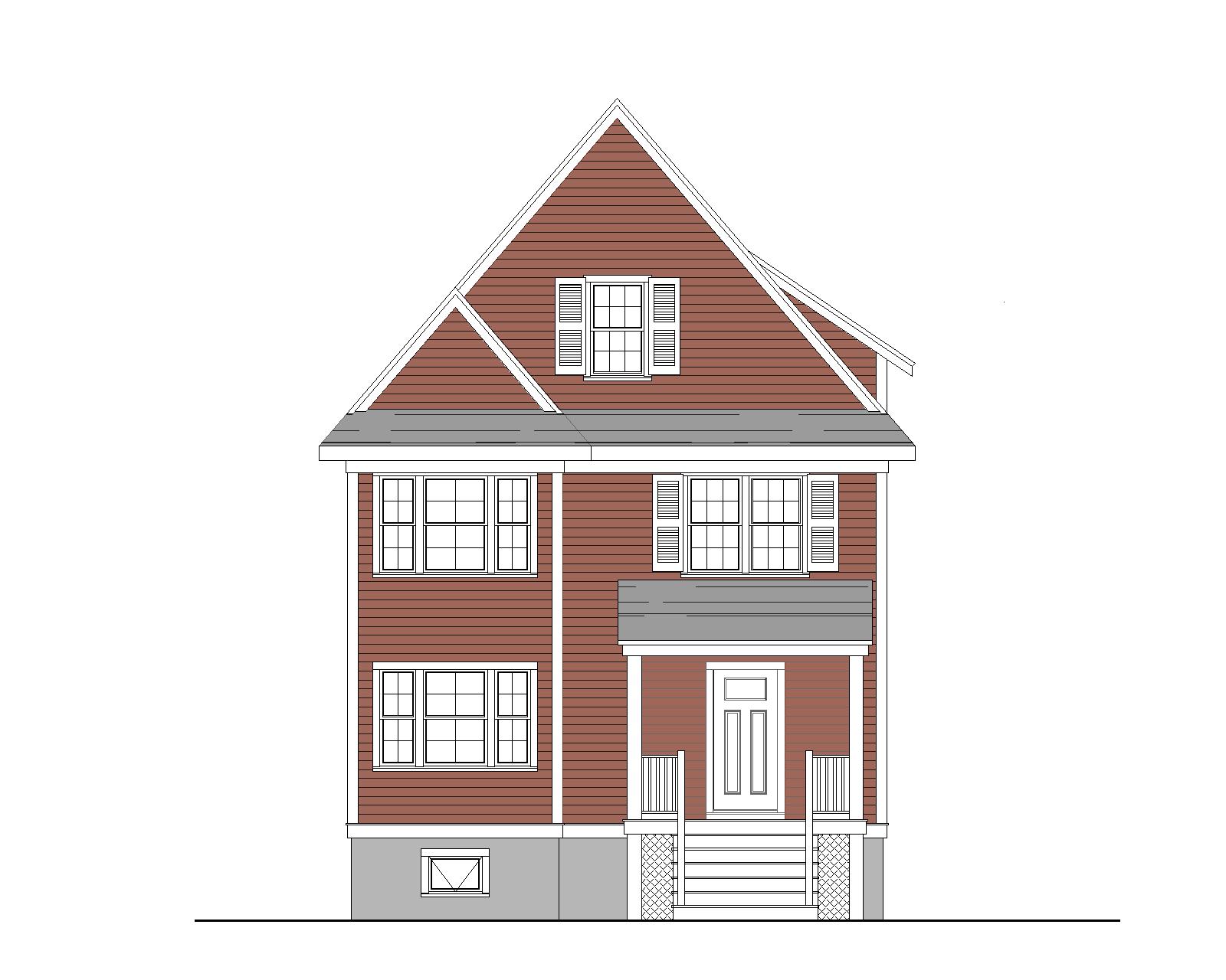 a single family residential home with gray asphalt shingle roofing and maroon siding lush landscape in an urban area on a corner lot with sidewalk down the left side as well with cascading shadows from the sun