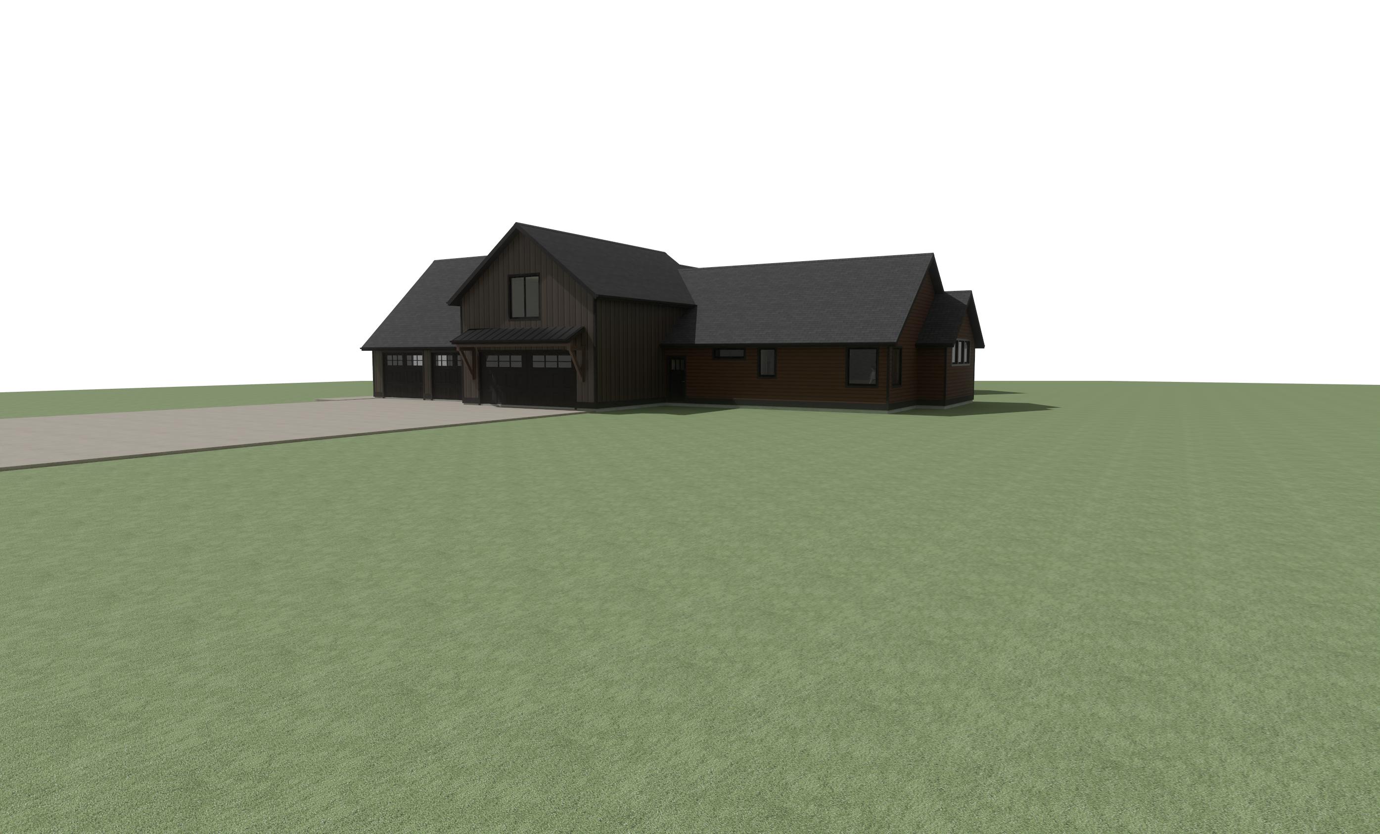 enhance the realism of the existing architectural design while maintaining the same materials and textures focus on realistic lighting shadows and surface details to create a lifelike appearance ensure the mixture of wood siding is preserved in the correct areas making them look authentic and cohesive so keep the horizontal siding and vertical siding the same as reference photo but change texture and color this is in montana add montana landscape but nice landscaping near the house add montana vegetation around house make horizontal siding canyon by diamond kote make all trim around doors and windows trim at bottom of house and fascia diamond kote onyx color make board and batten diamond kote color coffee make all wood stain sherwin williams charwood make rock like a stacked mountain modern style rock make nice landscaping in foreground do not add chimney do not add rock to walls