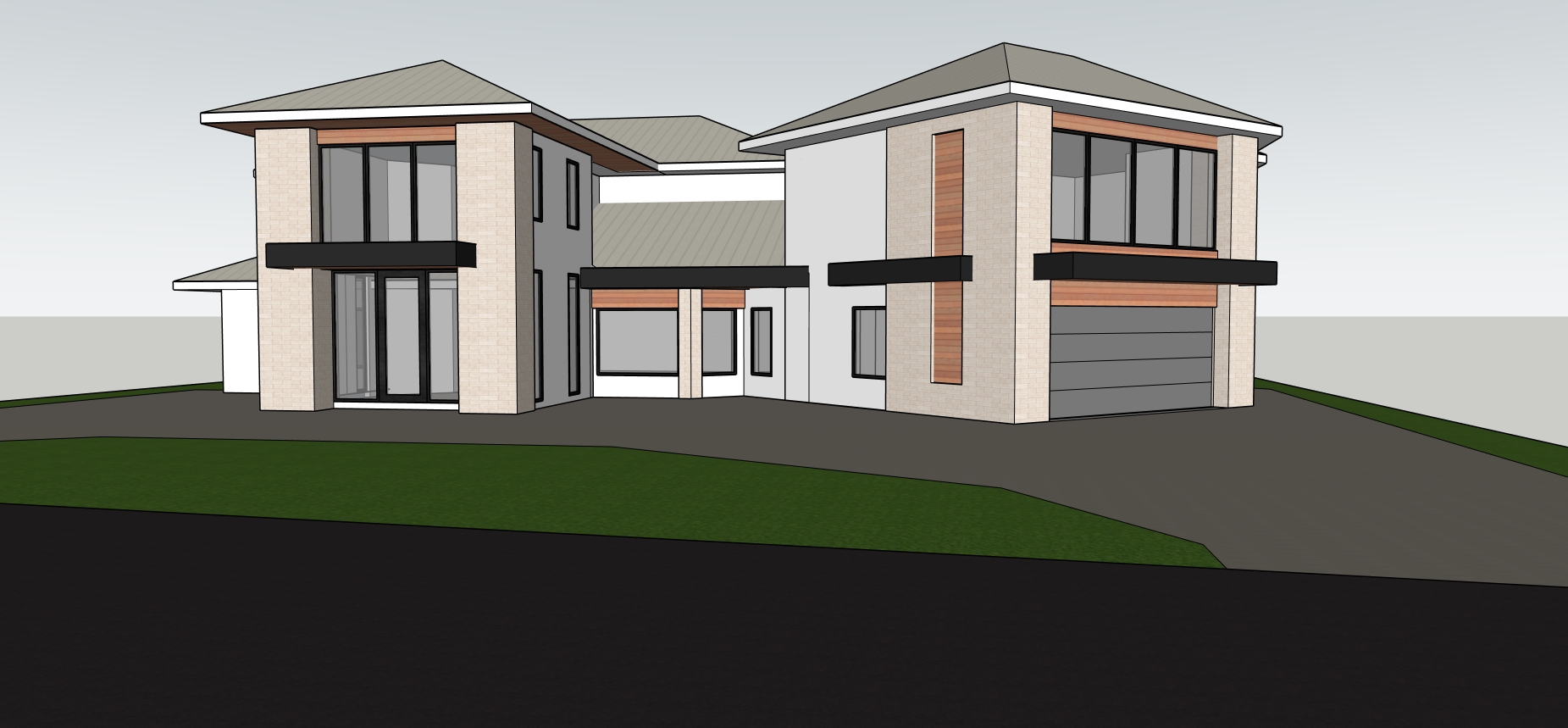 render a modern two story house with a sleek contemporary design the walls are off white with light beige stone accents the window frames and horizontal bands are a deep charcoal black the roof is a smooth light grey metal the wooden paneling under the roof line and above windows is a warm rich cedar brown the driveway is brick complementing the lush vibrant green lawn florida landscape set the scene in a serene early morning atmosphere with a soft overcast sky that casts gentle diffused lighting over the house
