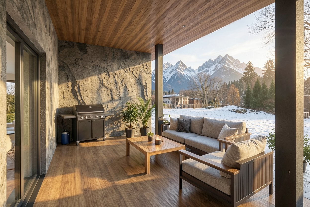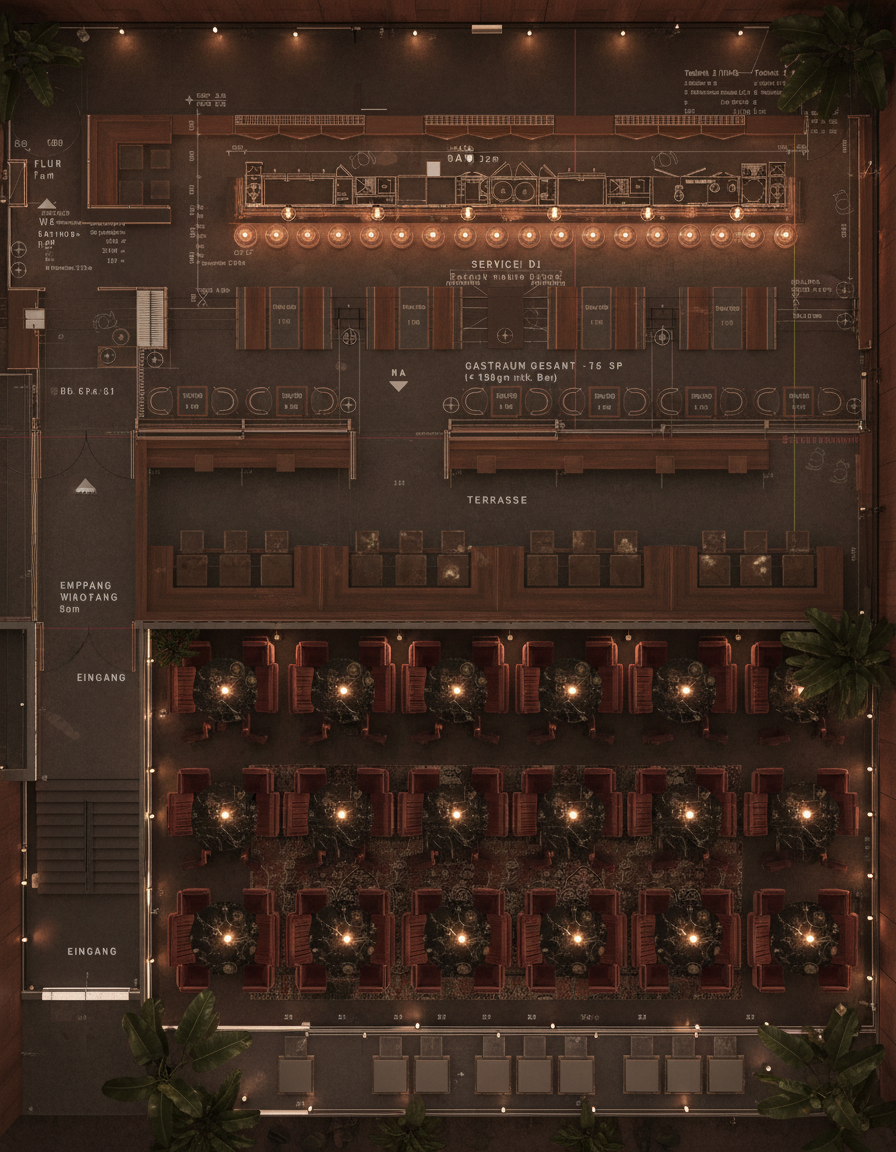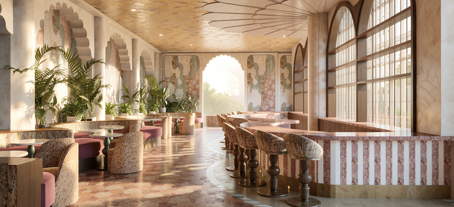 transform the provided restaurant interior image into a high end photorealistic render with warm golden hour atmosphere soft glowing highlights and relaxed upscale coastal energy while keeping everything exactly the same same proportions same bar shape same booth seating same ceiling curves same wall finishes same yellow curtains same materials and same spatial configuration do not move or alter any objects geometry textures colors or furniture positions the chairs throughout the restaurant must remain exactly in the same locations and proportions but their materials should read realistically the bar stools should appear upholstered in soft reddish brown leather with subtle natural sheen and cushioned tactile texture the dining chairs at the tables should appear in the same reddish brown tone but upholstered in soft velour with a matte plush surface and gentle directional nap while keeping their shapes frames and positions unchanged add premium table settings including wine glasses champagne flutes tropical style cocktails elegant plates cutlery cloth napkins and a seafood tasting arrangement with oysters while keeping all tables and chairs in their exact positions include modern young guests seated at the bar and at selected tables casually social correctly scaled tastefully integrated without crowding or obstructing architectural details add two bartenders behind the bar preparing drinks and interacting naturally while preserving the bar s structure and alignment the mosaic seafood display counter must clearly appear filled with ice fish lobsters shrimp and shellfish with cool reflections moisture and texture while keeping its exact position and shape unchanged on the bar shelves add wine bottles and premium alcohol bottles arranged tastefully and evenly while keeping the shelving structure unchanged the shelving should feature warm and bright accent lighting enhancing reflections and bottle silhouettes the wall behind the bar shelves must clearly appear as amber glass in a deeper richer golden amber tone with a ribbed textured surface and illuminated from behind with warm vivid backlighting while maintaining its exact geometry proportions framing and alignment lighting should emphasize golden hour warmth gentle reflections soft shadows enhanced color richness and luxurious catalog level realism improve depth and realism through wood grain richness marble shine brass highlights fabric texture and polished clarity while keeping the entire scene exactly as originally designed