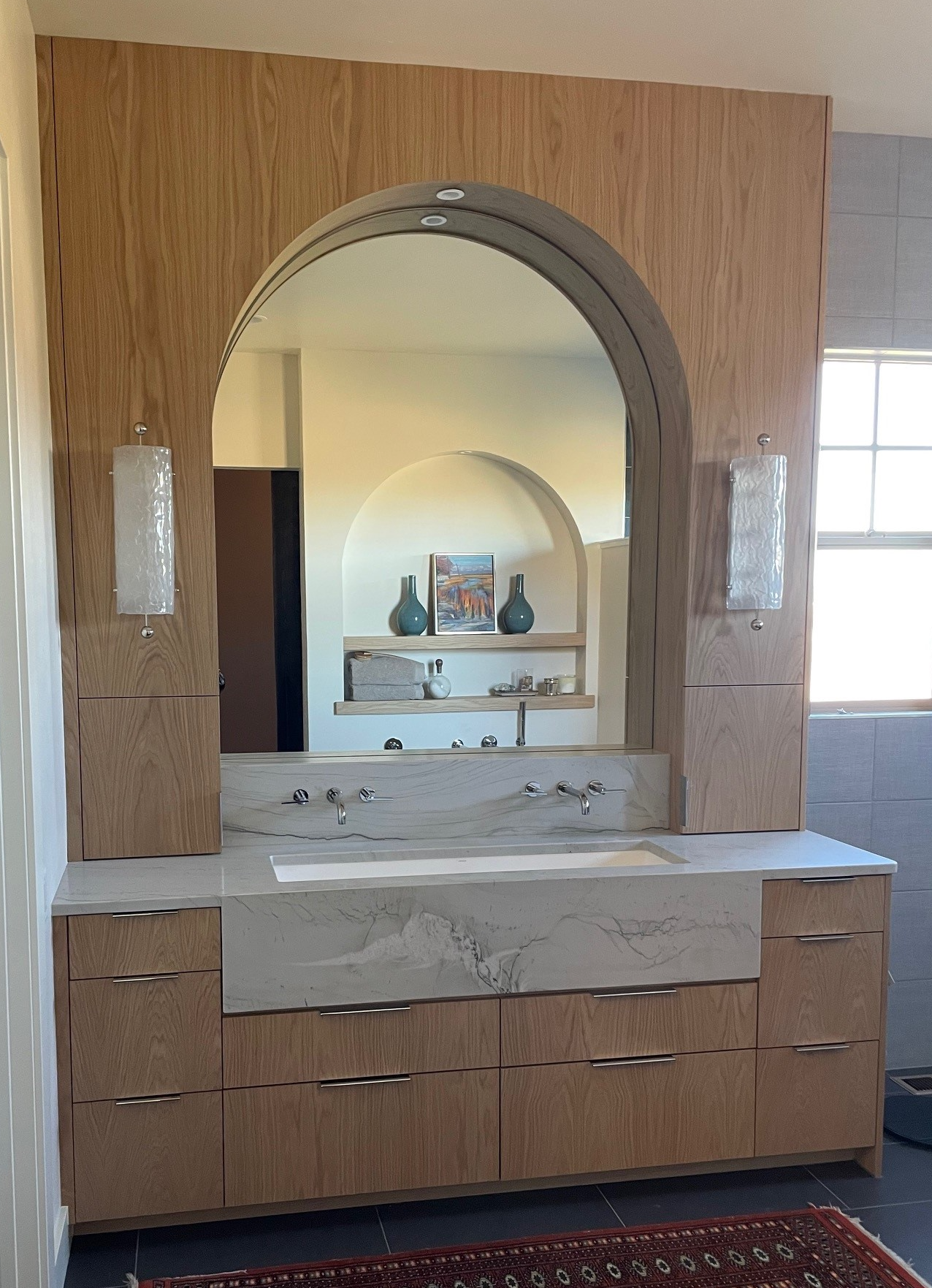 do not change the cabinets in any way preserve the exact cabinet colors materials finishes dimensions door and drawer styles hardware spacing alignment and all geometry exactly as shown do not alter the countertop shape backsplash appliances flooring lighting fixtures or wall structure only remove the construction materials clutter and mess from the scene clean the room and make it look finished and staged add a few simple tasteful home accessories appropriate for the style of the space such as a small plant soap dispenser or hand towel but do not add or remove any furniture windows or architectural elements maintain the original lighting direction and realism enhance clarity and polish the photo while keeping the cabinetry and room design completely unchanged turn the lights on change the mirror reflection to an elegant shower change the rug on the floor stage for a luxurious master bath