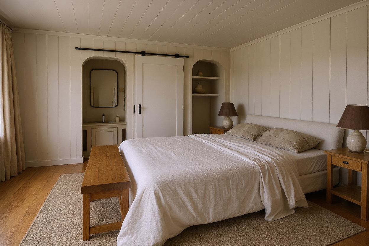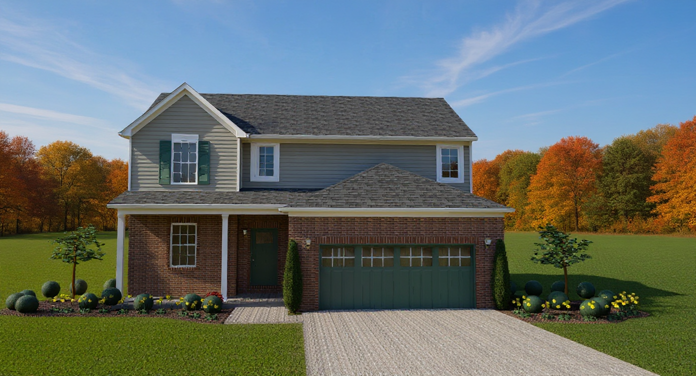 all walls are brick cladded the floors are concrete on the ground level the walkways are concrete and the areas around the walkways are grass there should be a clear opening to the back there are small white solid buildings in the background and a blue sky