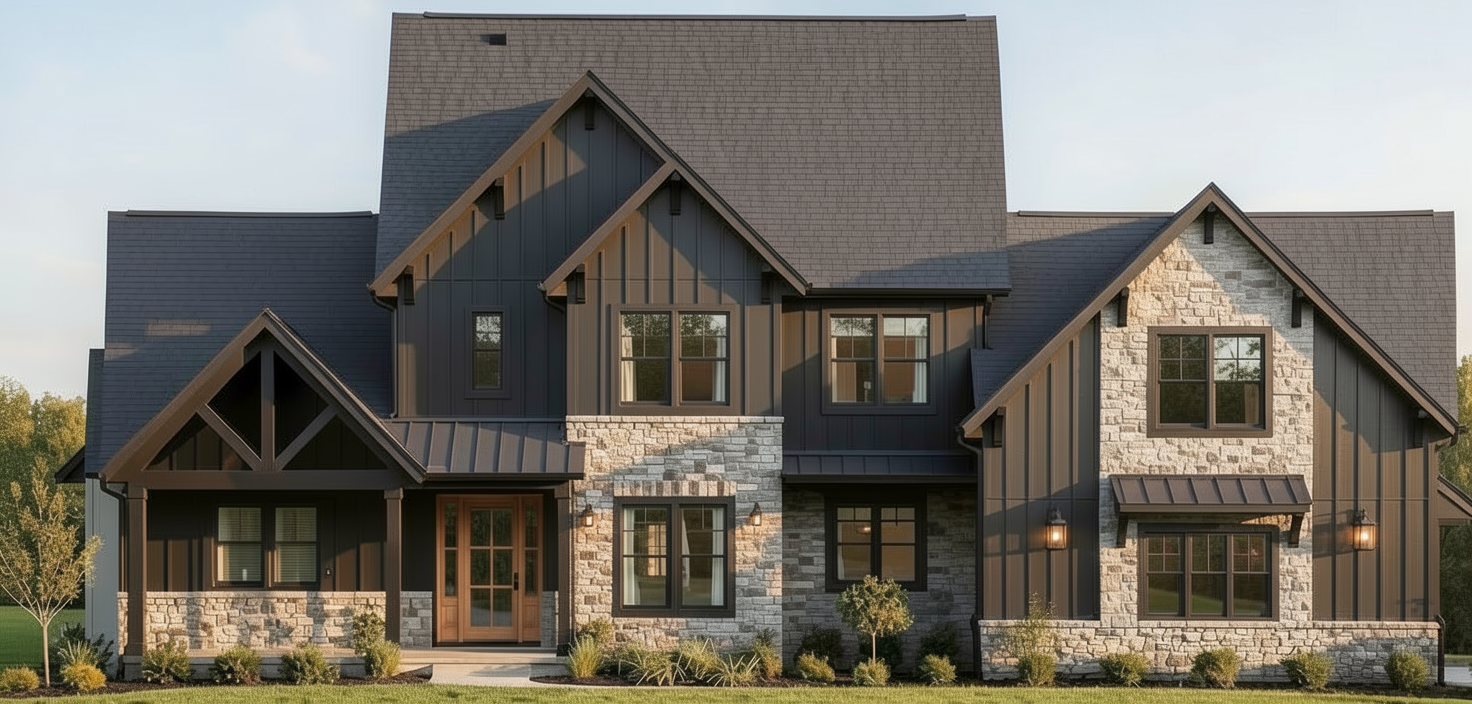 change the entry door to black change the stone accents to a lighter grey color