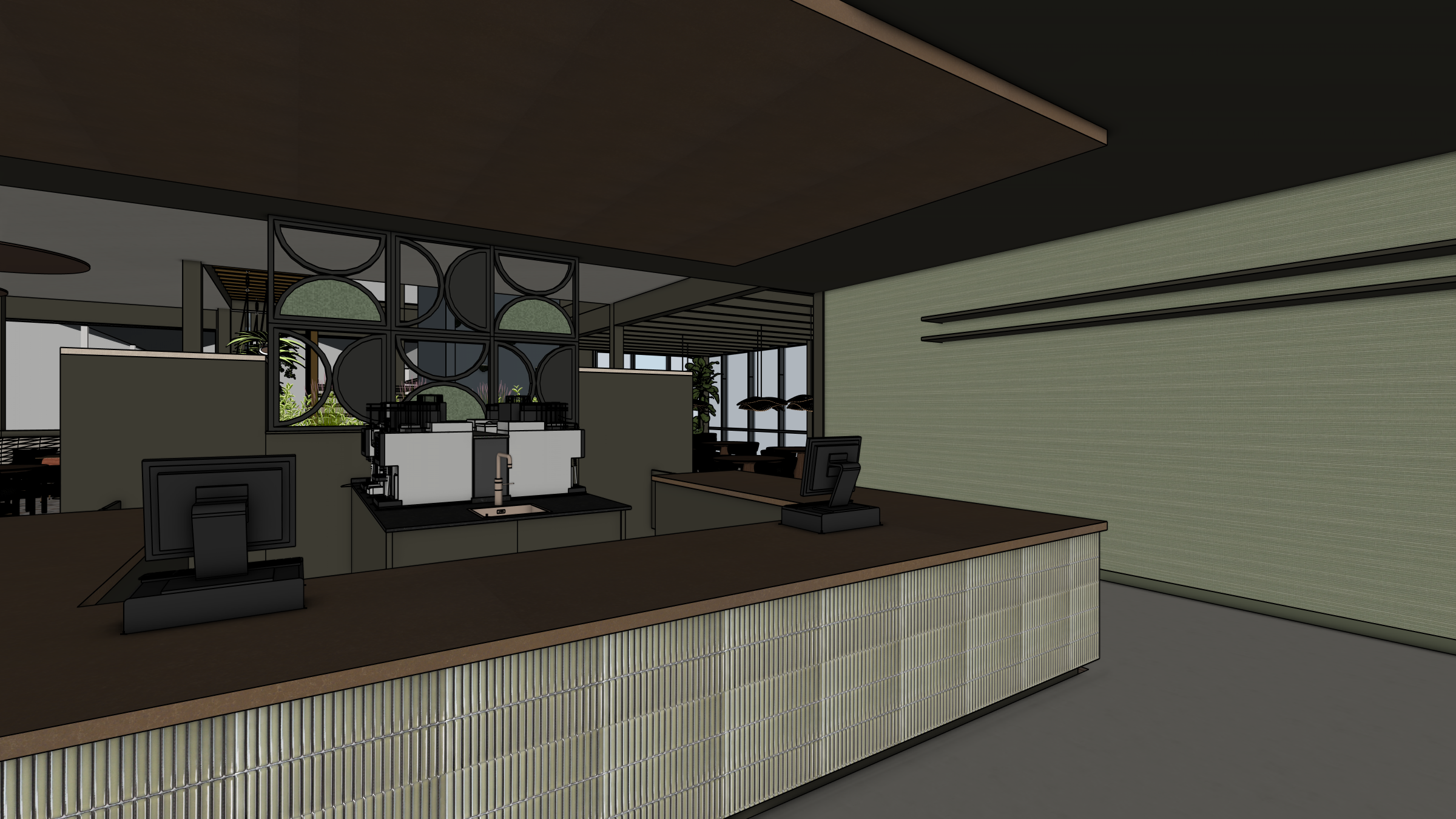 photorealistic interior architectural render of a high end coffee bar counter and rear service area based on the composition and perspective of image 11 png the atmosphere is warm inviting and luxurious with sophisticated architectural lighting and sfeervolle spotlights highlighting textures the front of the l shaped main counter is clad in tiny glistening urban olive glossy rectangular mosaic tiles from the mosaic factory the countertop is a rich dark brown natural stone quartzform style with an elegant polished finish the two cash registers monitors and two professional sleek dark colored matte black or dark bronze espresso machines remain in their positions active staff and customers bring the scene to life behind the cash registers a main barista is actively engaged with fingers touching and tapping on the pos screen ringing up an order positioned at one of the dark espresso machines a second barista is actively steaming milk with subtle steam visibly rising from a metal pitcher and another machine is pouring a perfect shot of espresso into a cup customers are engaged one customer is presenting a phone to pay at the counter and another stands nearby holding a reusable cup and observing the baristas work behind the main counter the large decorative geometric black metal room divider with half circles is filled with textured deep green fabric panels behind the two espresso machines the structure that was previously defined as cabinet units is now clearly composed of clean smooth painted partition walls no cabinet doors or handles finished in the deep brown attic 2 color from little greene parked clearly behind these new partition walls service carts mobile stainless steel and wood with wheels holding trays and supplies are visible the large wall on the right with the two black floating shelves remains covered in the heavily textured matte green vescom forte wallcovering the floor is seamless beige concrete the suspended ceiling feature directly above the bar is covered with textured felt panels in the rich deep date dark brown terracotta felt from tack tile the rest of the main ceiling surface is painted in a deep brown attic 2 color highly detailed textures glittering tiles polished stone felt fabric realistic poses and expressions of staff and customers a few detailed pastries on a wooden plank and beautiful reflections on glossy surfaces hyperrealistic 8k resolution cinematic lighting octane render