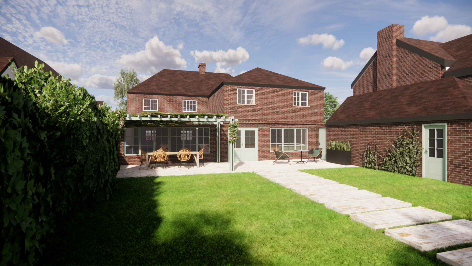 a beautifully rendered backyard scene featuring a charming brick house the house is constructed with classic reddish brown bricks and features a dark brown roof the windows and doors are painted a soft mint green adding a touch of freshness the pergola adorned with lush green vines provides shade over the patio area where natural wood chairs and a table are set the stone path leading to the house is composed of light gray stones blending harmoniously with the vibrant well manicured green lawn surrounding the garden are dense rich green hedges creating a sense of privacy and tranquility the sky above is a soft blue dotted with fluffy white clouds and the sun casts gentle warm light over the entire scene creating a peaceful inviting atmosphere the structure and materials remains completely unchanged
