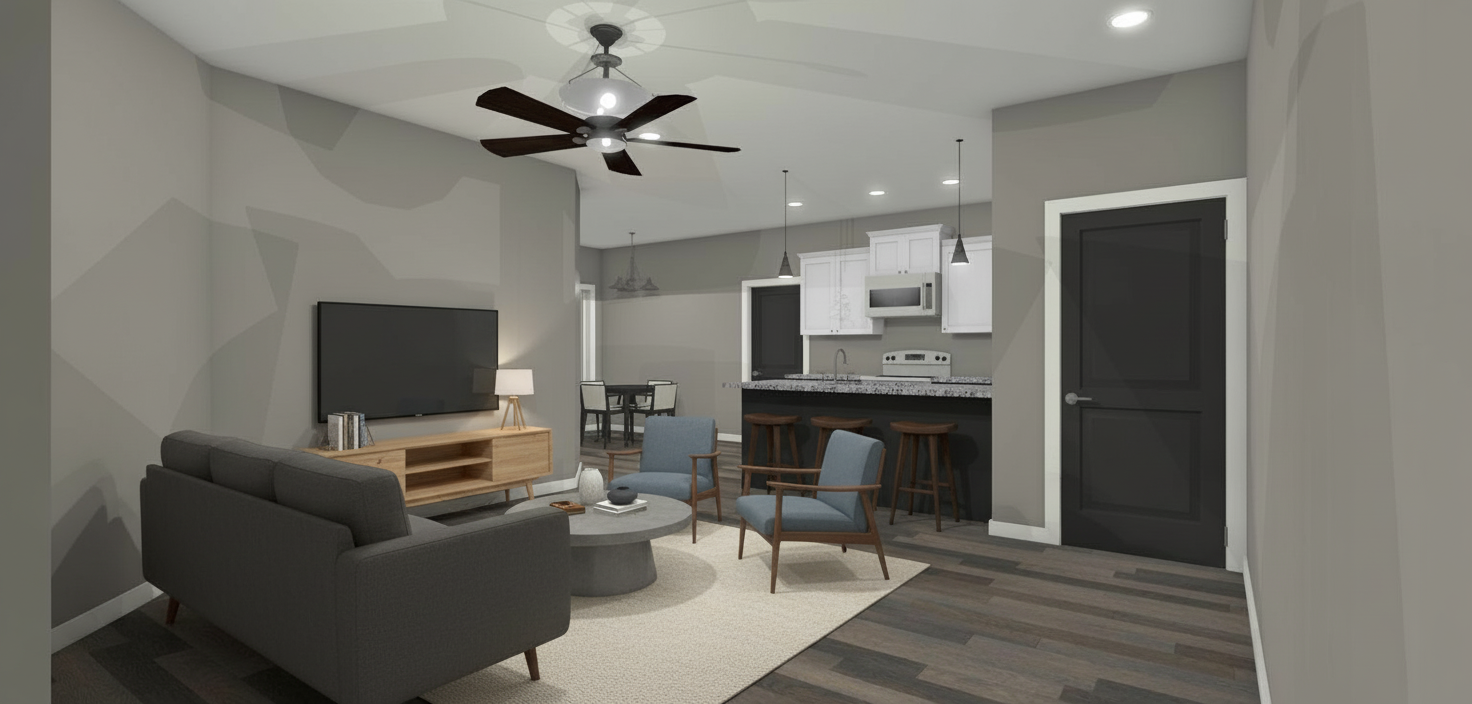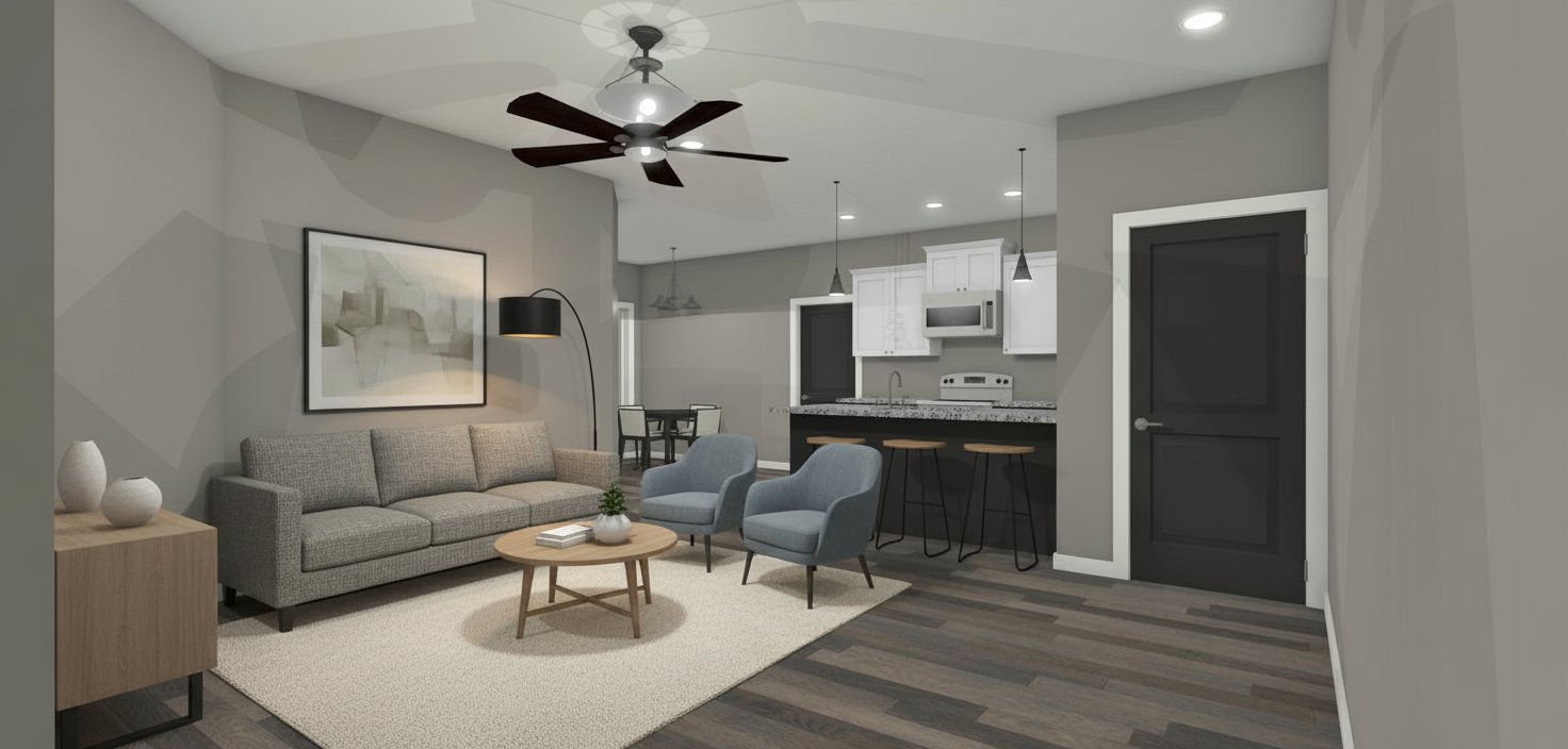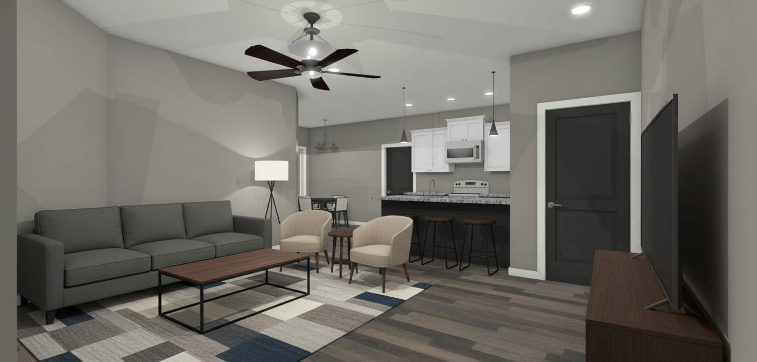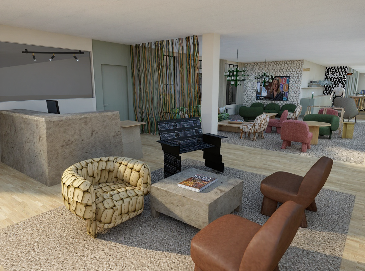 make it more photo realistic the black square chair in the front lounge is made out of computer keyboards keep the picture bright and daytime put some magazines on the sofa table but keep the lilght from the original picture perhabs a bit brighter in the front as from a dimmed pendant warm light
