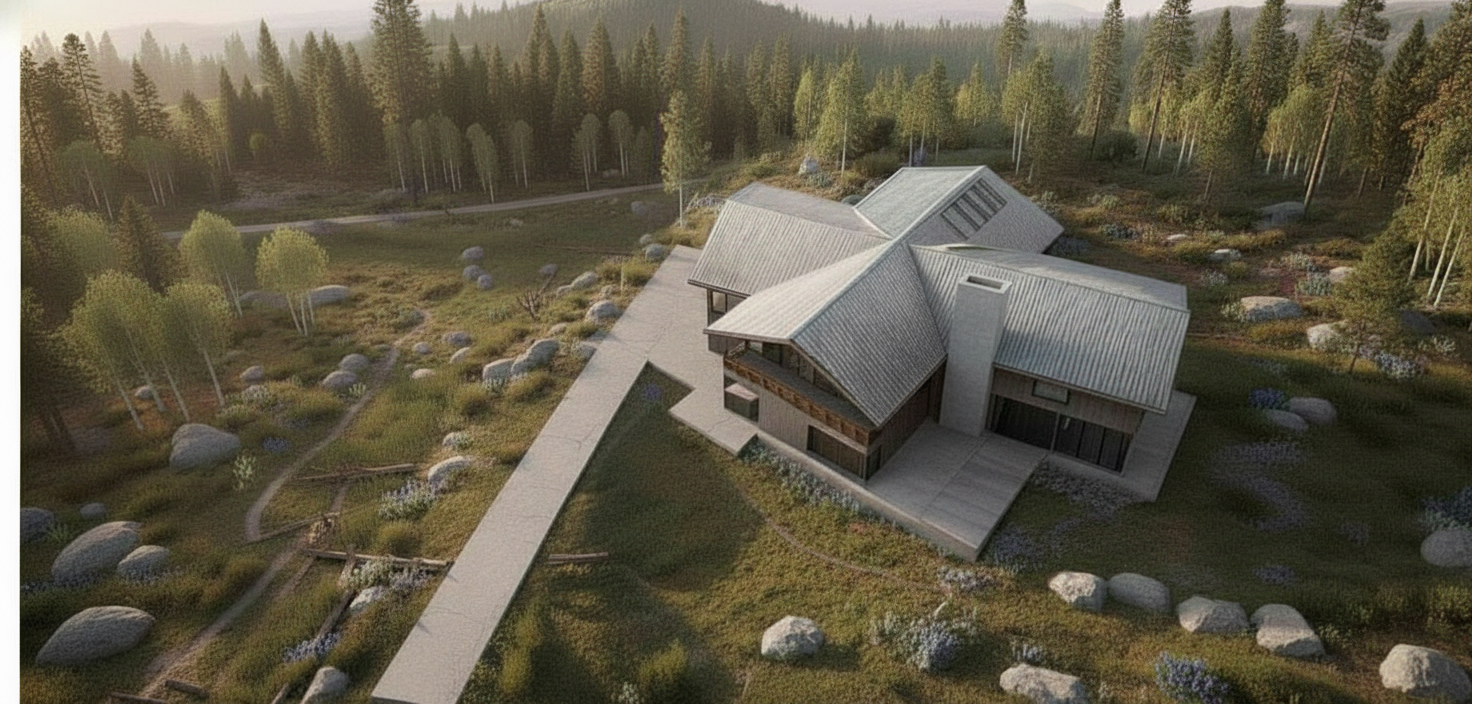 sunny day after a snowfall ultra high end v ray style final polish of the attached contemporary multi level home on a sloping hillside under full middle day springtime daylight and gentle snowfall maintain the exact camera angle composition layout colors and geometry without altering any architectural details roofs should show an accumulation of snow refine all materials for photorealistic detail