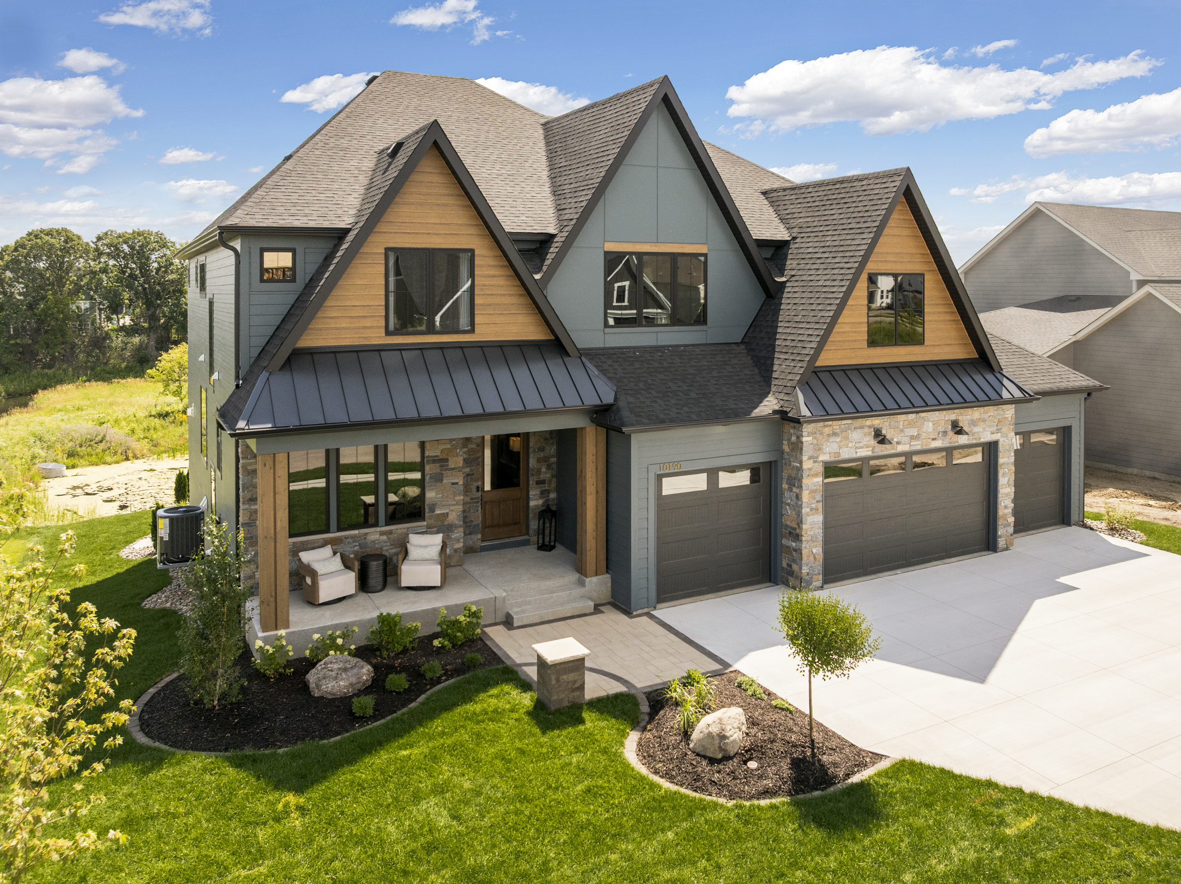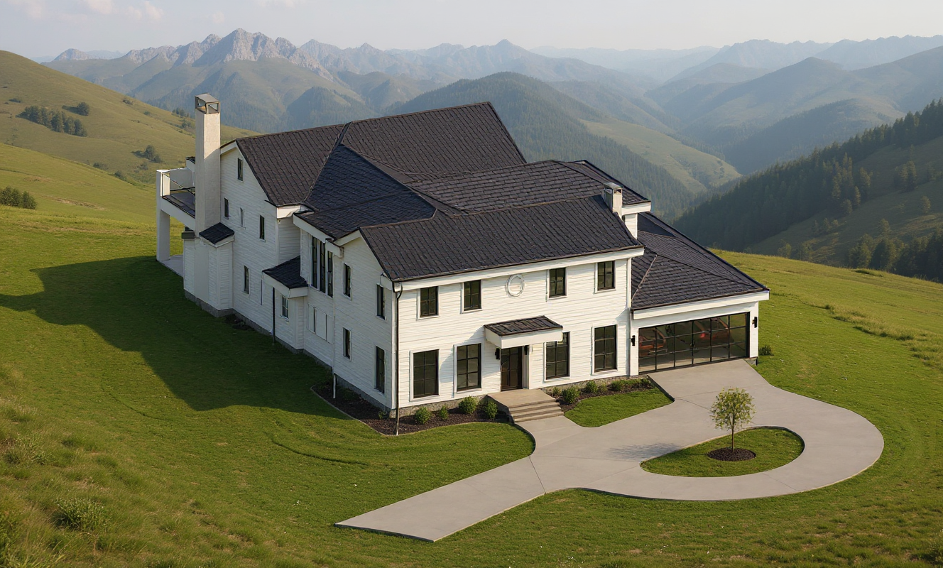 exterior shot a charming tudor style house with a steeply pitched roof and gabled front set in a serene suburban neighborhood during a sunny day the roof is covered in weathered brown shingles the walls are made of light cream stucco with dark brown exposed wooden beams the windows are framed in white reflecting a clear blue sky the garage doors are painted in deep forest green adding a pop of color surrounding the house a lush garden with vibrant green grass blooming with colorful flowers like red roses and yellow daffodils the overall atmosphere is warm inviting and peaceful with golden sunlight bathing the scene creating gentle shadows