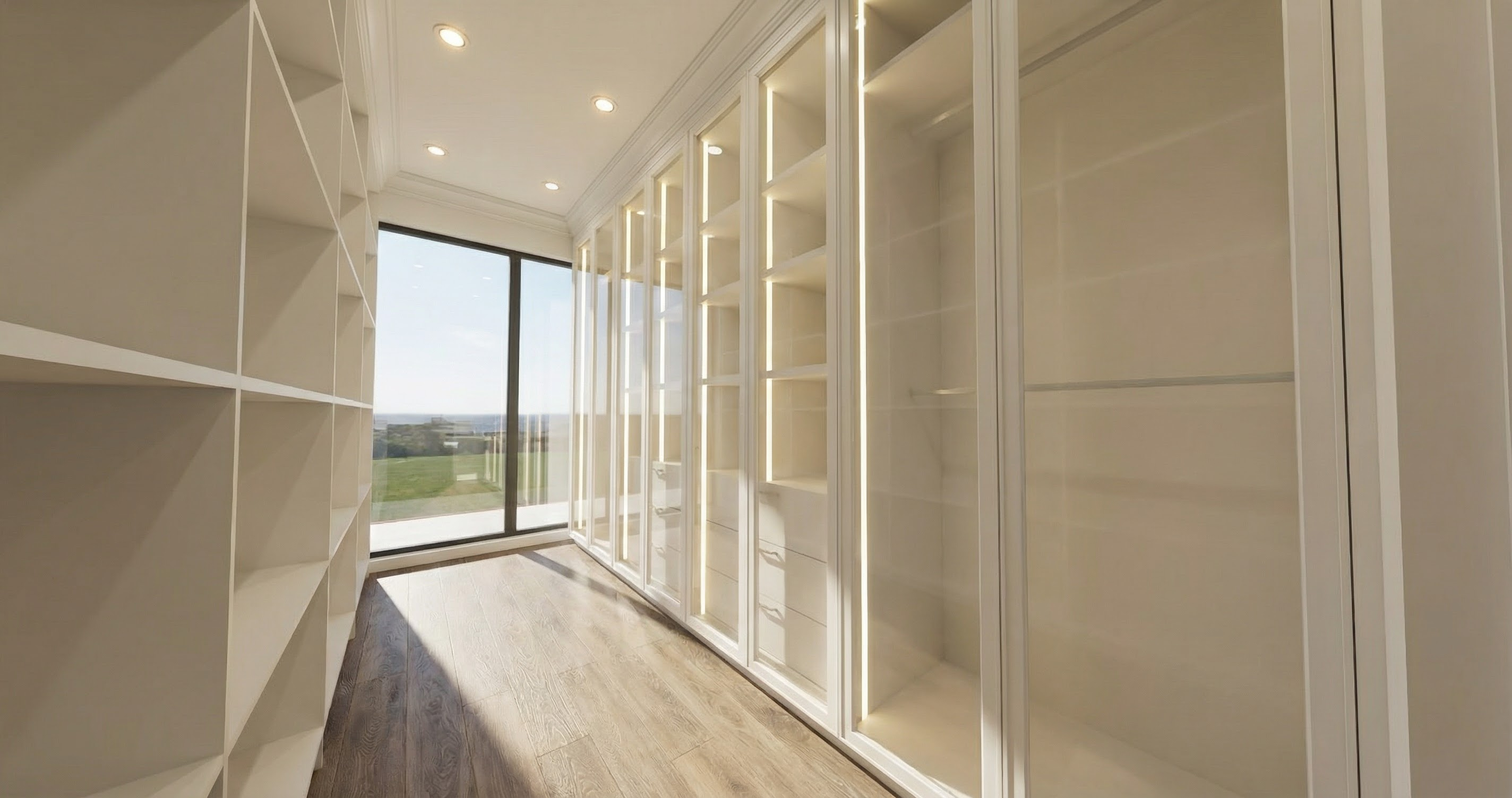 without changint the layout or architecture increase the realism of this image the shower walls and floor are tilebar ice gray honed 12 x24 marble tiles the cabinets are a slim shaker stained white oak