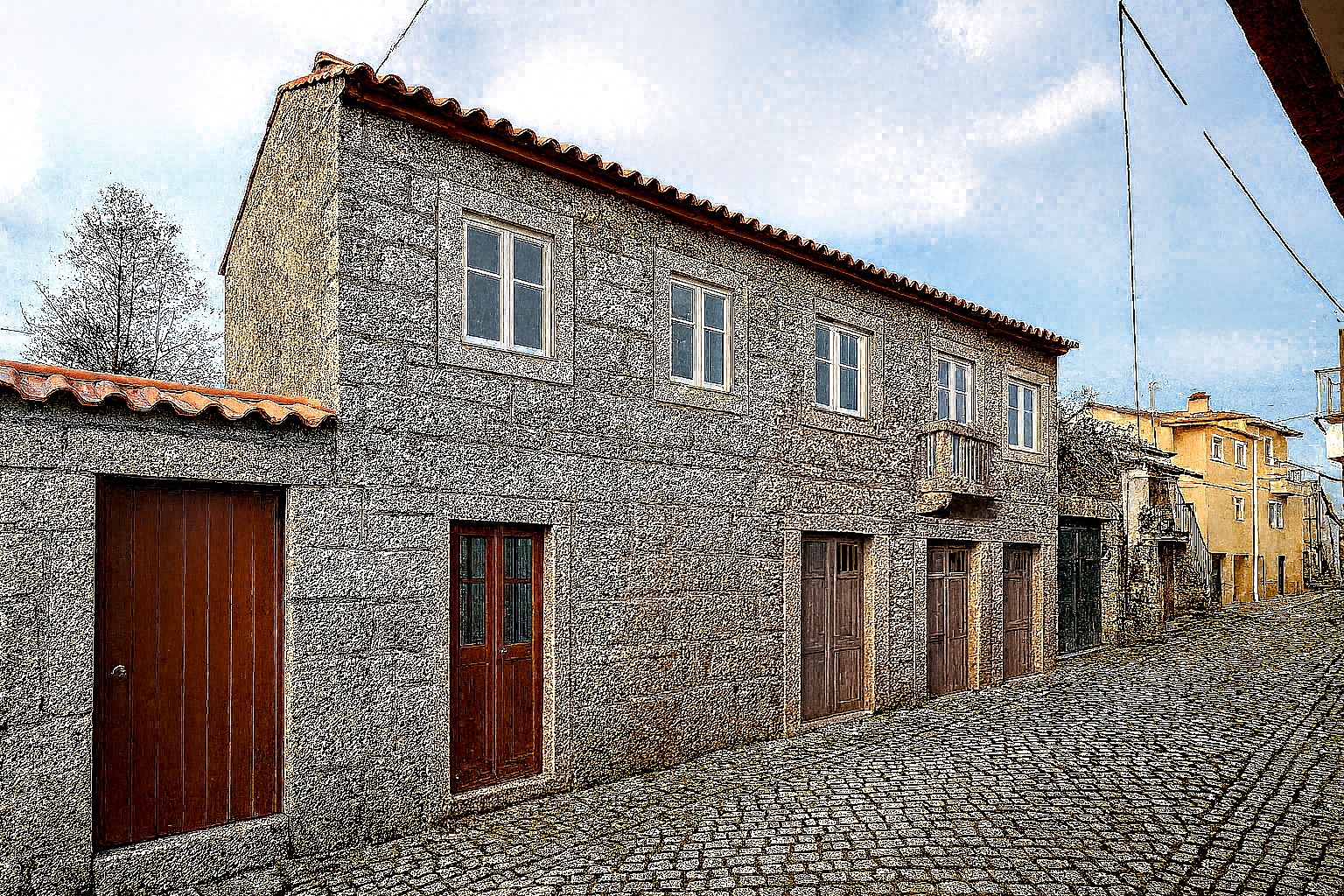 enhance the stone wall texture of the house shown in the image while keeping the exact same angle perspective lighting and overall composition of the original photo increase the realism of the stone by adding definition natural contrast and sharper detail between the joints fix graininess or distortions and reduce artificial noise fully preserve the original colors of the stone as well as the doors windows roof and surrounding environment modifying only the wall texture to make it look more natural clean and realistically restored