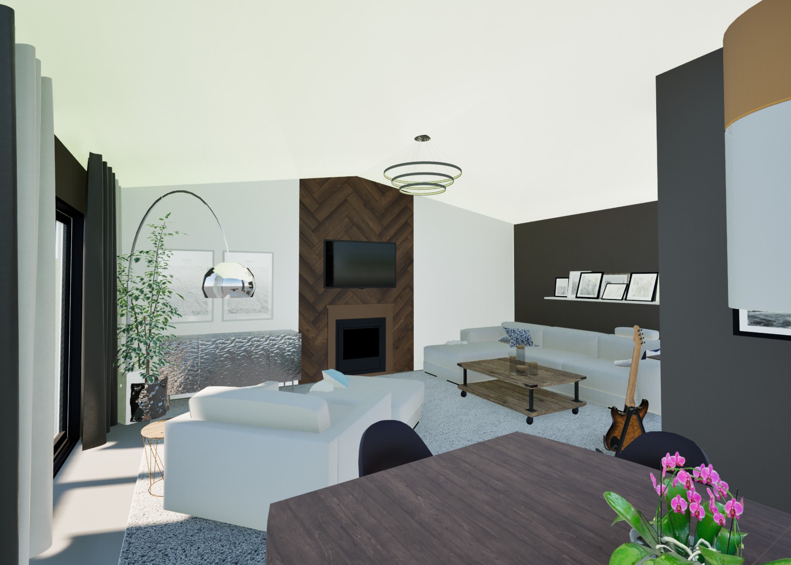 modern living room spacious and elegant atmosphere featuring a sleek white ceiling and cozy gray carpet the walls combine crisp white and a chic dark gray accent a striking herringbone wood panel showcases the television and fireplace area offering warmth with its rich brown tones a comfortable white sectional sofa surrounds a rustic wooden coffee table a chrome arc floor lamp adds a modern touch while black and white framed artwork lines the dark accent wall tall green potted plant brings life to the room with soft natural sunlight filtering through large windows a wooden dining table with subtle textures accented by vibrant pink flowers completes the space