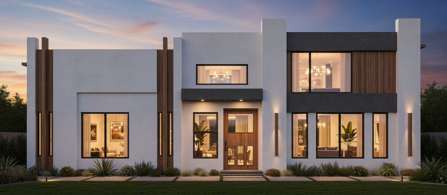 generate beautiful elevations renders with light inside with white stucco on front walls down from above with sunlight at dusk realistic look you want modern luxury interior with natural lighting photorealistic outdoor scene with soft shadows used black color light fixture