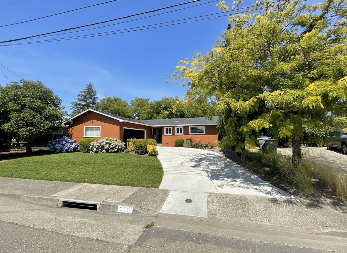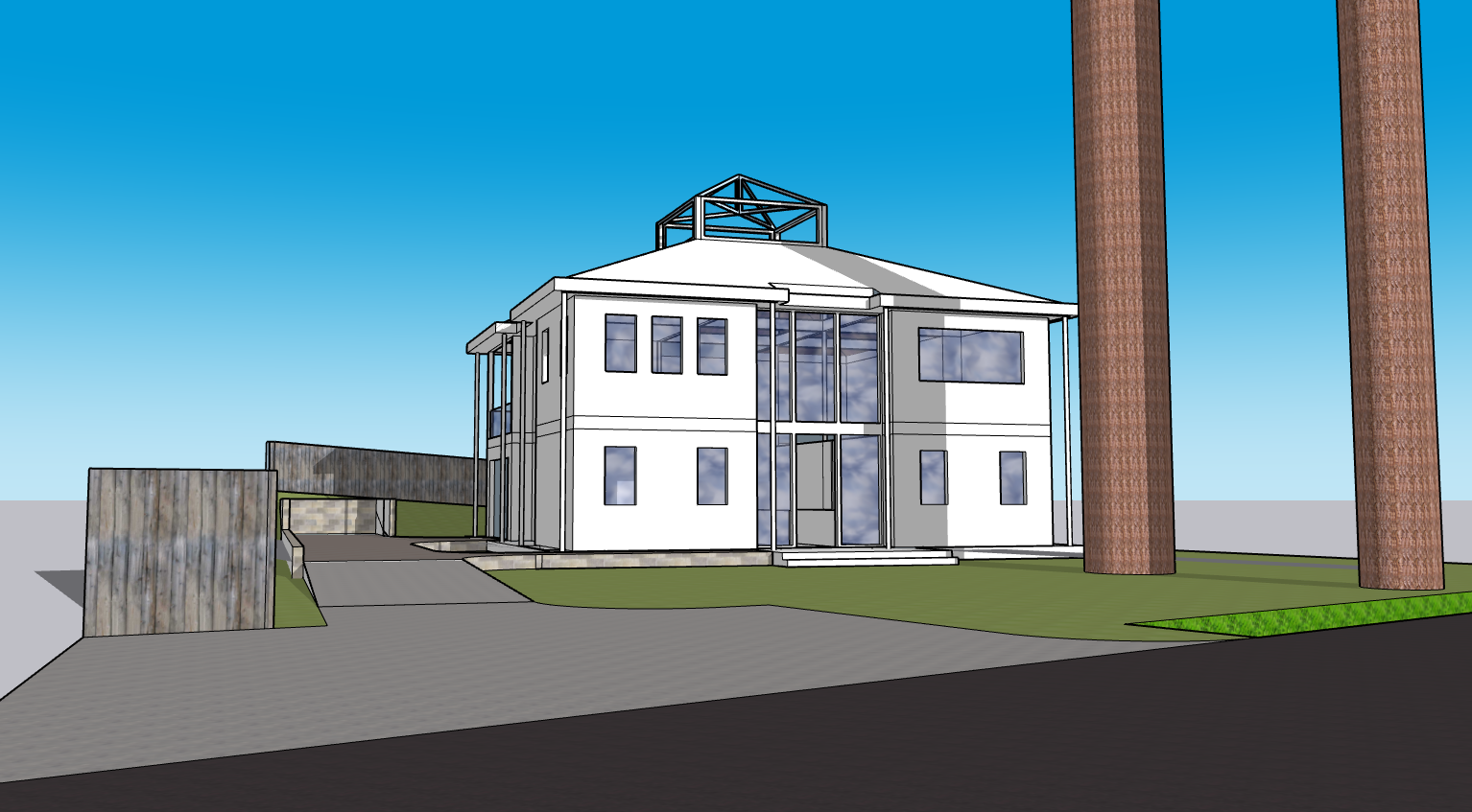two story modern american four square style warm stucco exterior walls wood framed casement windows standing seam metal roof white ramped permeable paving driveway native grasses two large walnut trees as shown mid morning july northern virginia