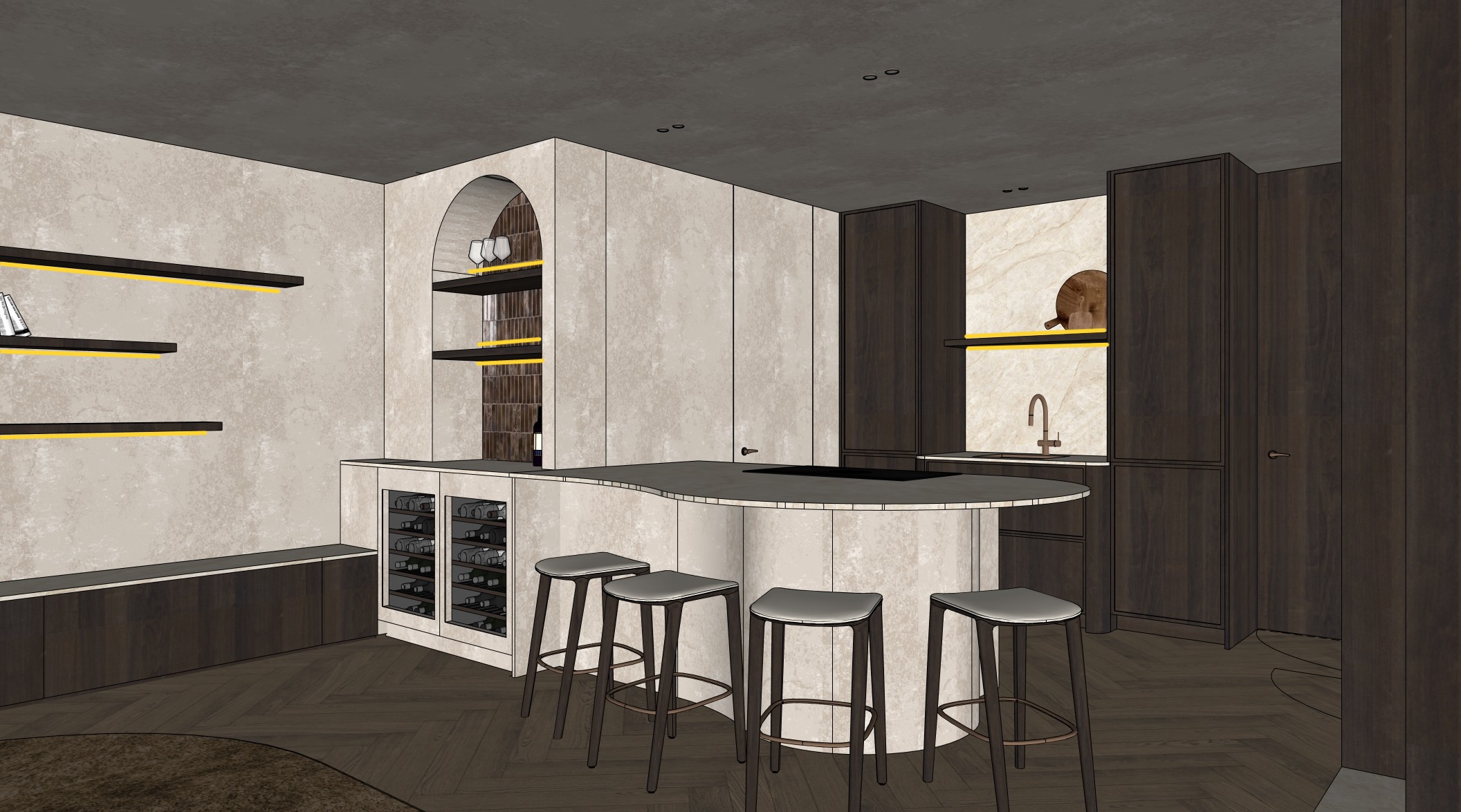 high end kitchen bar arch niche bronze details led accents strict camera match full scene lock 64k ultra photorealism pbr only no redesign create an ultra high end 64k ultra photorealistic architectural interior render based strictly on the uploaded reference image this is an existing interior design all spatial layout geometry proportions cabinetry layout wall positions ceiling planes island shape bar stools wine coolers arched niche shelving sink zone and circulation must remain 100 identical to the reference image no redesign no reinterpretation no repositioning no added or removed elements camera must match exactly treat the reference image as a camera matched architectural backplate camera image quality absolute lock exact same camera position height and distance same framing and crop same two point perspective architectural lens feel 24 28 mm perfect verticals no distortion image quality 64k resolution ultra sharp focus across entire image no depth of field no blur haze fog or bloom crisp edges extreme micro detail architecture geometry fixed curved kitchen island bar with seamless plaster finish integrated wine coolers under island large arched niche behind bar continuous wall planes with no visible seams tall cabinet wall at sink zone floating shelves on left wall soft natural rounding everywhere no sharp corners no visible joints or panel seams in walls arched niche fully seamless walls ceiling bar paint technique locked walls ceiling and full bar front finished in the same decorative paint plaster technique mineral lime based appearance subtle texture and tonal variation matte not flat no uniform surfaces no stone on bar front no panel lines no visible transitions at bar stools wood elements dark veneer strict applies to all cabinetry column cabinets floating shelves bench base material dark wood veneer identical tone everywhere seamless pbr textures correct grain direction satin mat lacquer visible pores and depth column cabinets blue line definition critical column cabinets blue outlines in reference one door in width two doors in height framed doors with 15 mm frame thickness same dark veneer as all other cabinetry subtle rounded edges no slab doors no multiple vertical divisions no extra doors stone taj mahal quartzite satin applies to island bar countertop sink countertop backsplash behind faucet open niche next to sink wall properties taj mahal quartzite satin finish soft natural sheen real mineral veining no gloss no flat look wine coolers integrated under the bar front panels finished identical to wall material plinth below wine coolers in lighter pale tone realistic interior lighting transparent glass bottles only arched niche shelves led glass shelves dark veneer shelves seamlessly integrated led yellow lines add led strips exactly where yellow lines are indicated warm neutral light 2700 3000k indirect architectural glow led source not visible no extra leds no visible led lines decor exactly 3 wine glasses in the arched niche ultra clear glass realistic refraction no additional decor left wall shelves floating shelves remain in place remove all decoration shelves remain empty lighting realistic functional critical ceiling spots bronze finish must actively emit light clearly visible realistic light cones soft beam spread with natural fall off subtle hotspots on surfaces warm neutral color temperature 2700 3000k light interaction must be visible on plaster walls wood veneer stone surfaces floor texture no decorative only spots no flat ambient lighting furniture locked bar stools identical to reference upholstery unchanged legs in dark metal with bronze accents floor herringbone parquet one tone lighter than reference natural wood variation realistic gloss and relief correct plank scale lighting mood soft natural daylight even exposure no dramatic contrast no cinematic lighting negative prompt mandatory cgi look render look illustration stylized lighting cinematic lighting flat materials flat walls flat ceilings sharp corners wrong cabinet divisions slab doors extra leds visible led strips added decor removed elements wrong stone glossy plaster plastic materials fake wood blur haze fog bloom noise low resolution camera change people clutter game engine look high end kitchen bar arch niche bronze details led accents strict camera match full scene lock 64k ultra photorealism pbr only no redesign create an ultra high end 64k ultra photorealistic architectural interior render based strictly on the uploaded reference image this is an existing interior design all spatial layout geometry proportions cabinetry layout wall positions ceiling planes island shape bar stools wine coolers arched niche shelving sink zone and circulation must remain 100 identical to the reference image no redesign no reinterpretation no repositioning no added or removed elements camera must match exactly treat the reference image as a camera matched architectural backplate camera image quality absolute lock exact same camera position height and distance same framing and crop same two point perspective architectural lens feel 24 28 mm perfect verticals no distortion image quality 64k resolution ultra sharp focus across entire image no depth of field no blur haze fog or bloom crisp edges extreme micro detail architecture geometry fixed curved kitchen island bar with seamless plaster finish integrated wine coolers under island large arched niche behind bar continuous wall planes with no visible seams tall cabinet wall at sink zone floating shelves on left wall soft natural rounding everywhere no sharp corners no visible joints or panel seams in walls arched niche fully seamless walls ceiling bar paint technique locked walls ceiling and full bar front finished in the same decorative paint plaster technique mineral lime based appearance subtle texture and tonal variation matte not flat no uniform surfaces no stone on bar front no panel lines no visible transitions at bar stools wood elements dark veneer stri