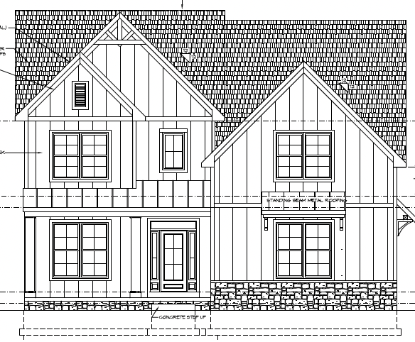 exterior shot white siding with black roof window trim and accents stone should be white fieldstone style