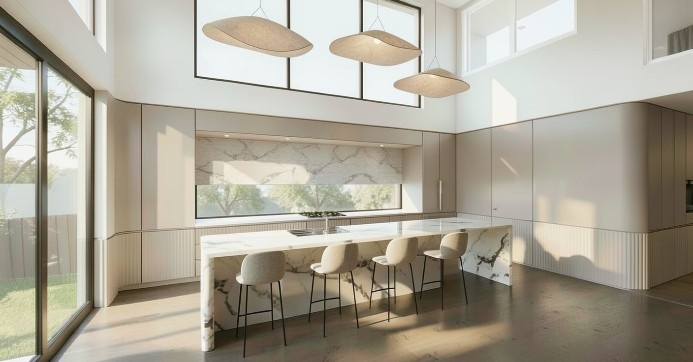keep image geometry mood natural light and image aspect ratio only change kitcehn stone to be busier similar to arabescato