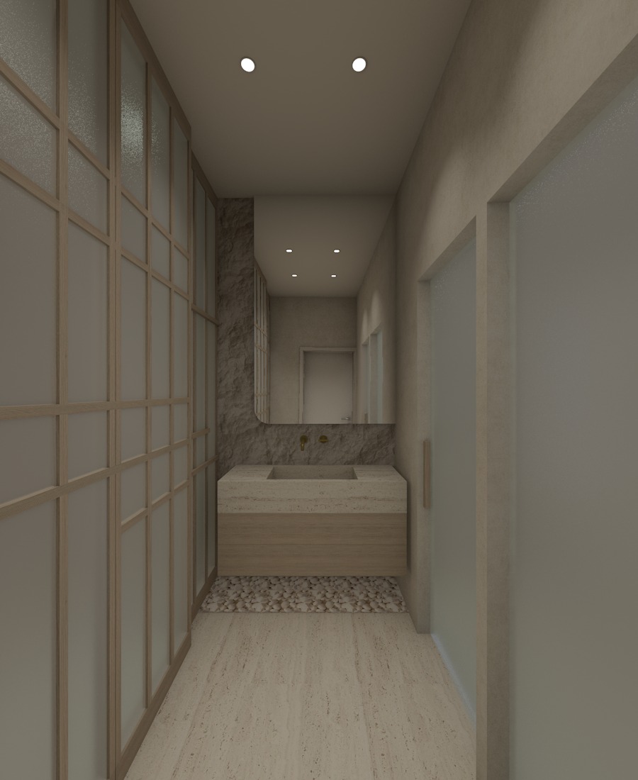 create a highly realistic render of a narrow bathroom corridor with a calm warm and refined atmosphere the design feels minimal elegant and high end with a soft natural palette and balanced lighting on the left side there are full height sliding doors with wooden frames and panels incorporating frosted glass the glass has a diffused translucent quality that softly obscures the interior allowing light to pass through while maintaining privacy on the right side there are two doors with the same frosted glass finish maintaining visual consistency and a clean architectural rhythm at the end of the corridor there is a floating vanity the base is made of light natural wood with a minimal and clean design the countertop is in natural soft beige travertine with a subtle texture and matte finish the sink is integrated into the countertop and the faucets are wall mounted in a clean white finish adding a refined and contemporary touch below the vanity there is a recessed area filled with natural white pebbles adding an organic and spa like element to the space behind the vanity the wall is finished with natural stone in a raw texture creating contrast with the smoother surrounding surfaces a full width mirror enhances the depth of the space the walls are coated in light beige microcement creating a seamless and soft background the floor is in a light natural stone tone enhancing the calm and cohesive aesthetic the lighting is soft and diffused coming from recessed ceiling spotlights creating minimal shadows and a warm luxurious ambiance ultra realistic render high resolution premium materials interior design magazine photography style
