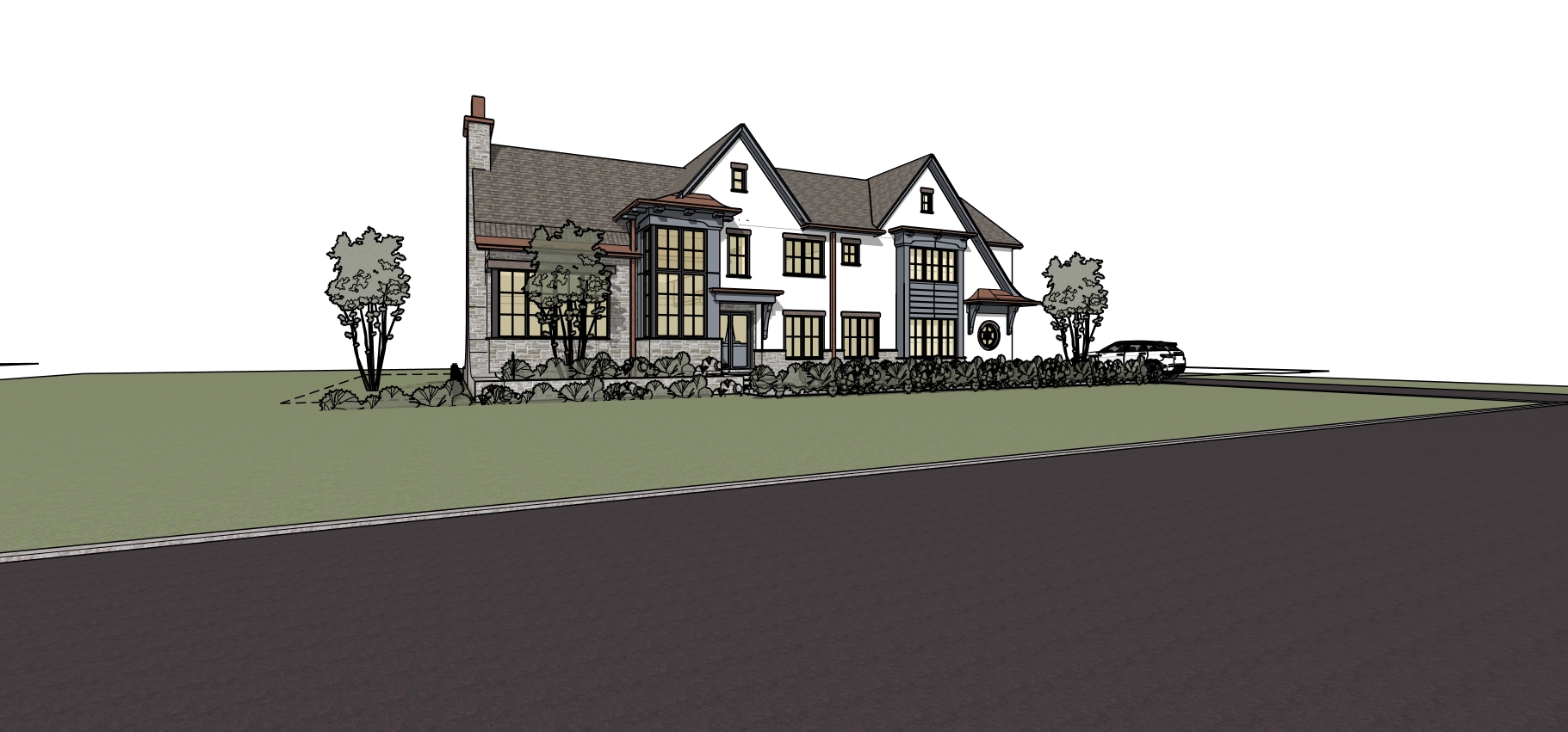 charming industrial stone and stucco farmhouse with large grid windows set with grass lawn trees in background light distant fog maintain model geometry and materials white stucco new gray england stone base