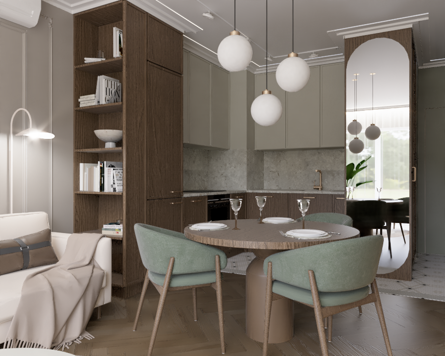 interior design modern living dining space stylish and elegant atmosphere light gray walls dark wood bookshelves and cabinets round dining table with light wood finish mint green upholstered chairs beige couch with soft brown and cream throw blanket round white globe pendant lights neutral gray floor tiles large mirror reflecting natural light soft ambient lighting minimalist decor serene and cozy ambiance