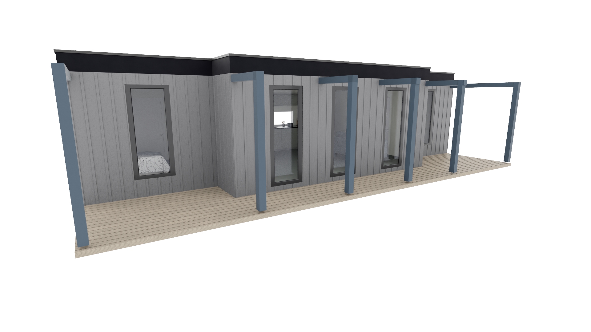 a modern modular house with a sleek design featuring a light gray wooden exterior the windows are tall and slim with dark gray frames adding contrast and elegance the supporting beams and structures are painted in a muted dark grey complementing the black tones the deck is a soft beige wood adding warmth to the scene the atmosphere is bright and inviting with soft natural lighting creating a calming ambiance