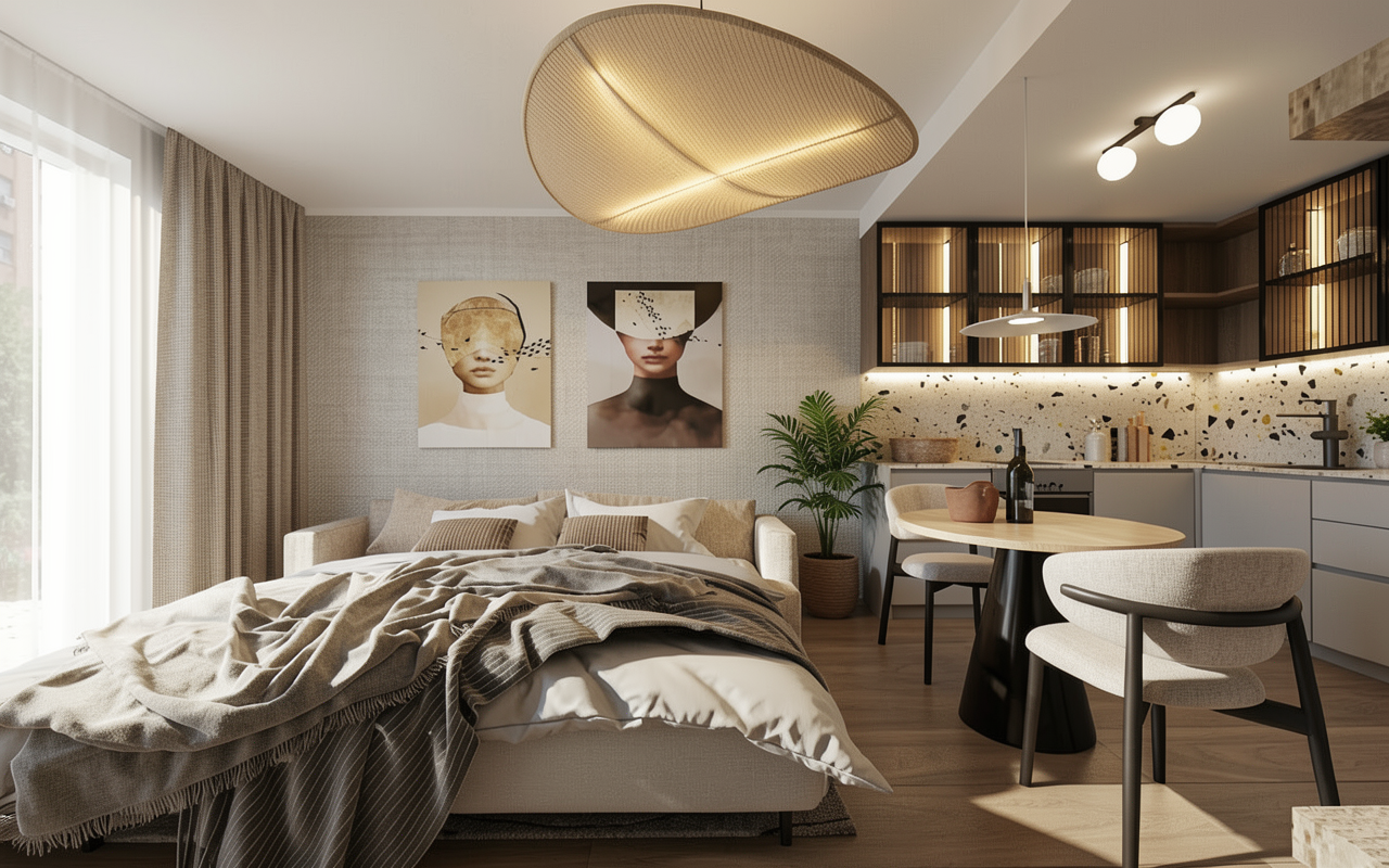 photorealistic interior enhancement of the original image maintain identical composition camera angle proportions and layout improve realism through advanced global illumination soft natural daylight entering from the left window realistic shadow gradients and subtle ambient occlusion enhance material realism natural wood wall and floor with subtle grain variation and micro imperfections fabric sofas with visible textile texture and soft light absorption matte black kitchen surfaces with slight roughness variation and realistic reflections painted walls with very fine surface irregularities soft atmospheric depth gentle contrast balanced exposure professional architectural photography style no changes to furniture architecture or spatial arrangement ultra realistic high end interior visualization do not change furniture layout geometry or proportions no new objects no style change no artistic or cinematic effects no exaggerated contrast no color shift no glossy or plastic materials no ai artifacts no blur no depth of field no dramatic lighting no over sharpening no people