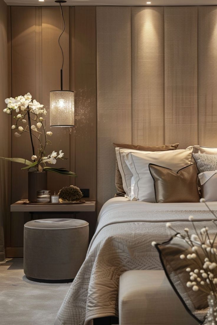 interior shot earthy contemporary tropical bedroom matte textures bamboo and plaster surfaces muted beige and cocoa palette solid wood furniture with cane detailing natural linen fabrics warm filtered daylight through louvered panels ceramic and organic decor tactile materials cinematic photoreal render warm cozy tropical tone