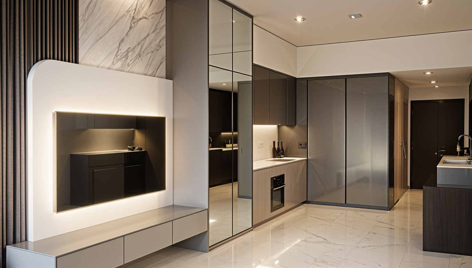 render a modern kitchen interior with an inviting atmosphere use light oak wood for the lower cabinets and shelves paired with matte olive green for the tall pantry the upper cabinets have a soft beige hue creating a balanced look the countertops are a smooth white quartz complemented by a sleek black faucet and stove the walls are painted in a crisp white enhancing the natural light from a large window with a view of vibrant green foliage and red flowers outside the flooring is light hardwood adding warmth to the overall space aim for a cozy and elegant ambiance
