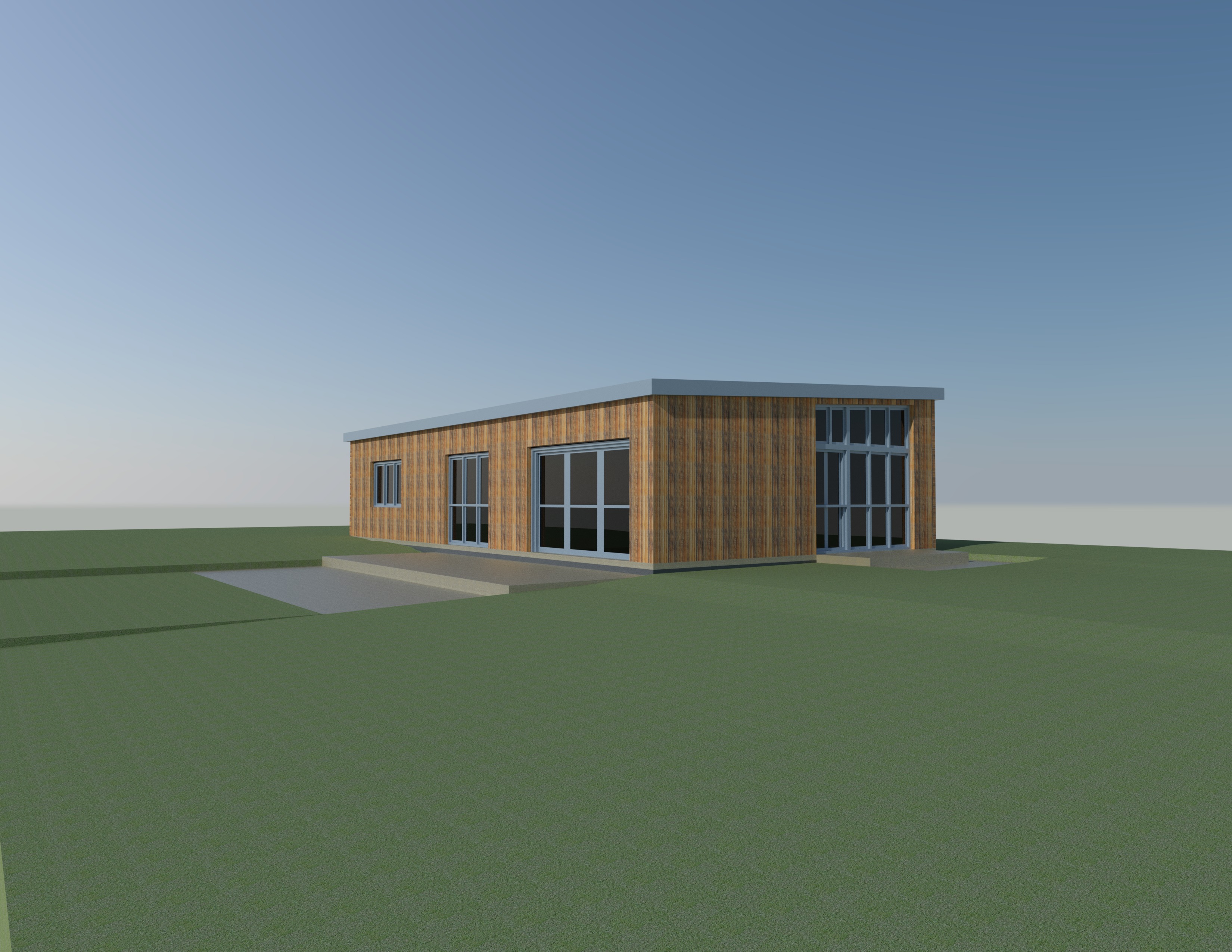 walls vertically clad with cedar in a field setting with a hedged boundary sunny spring day
