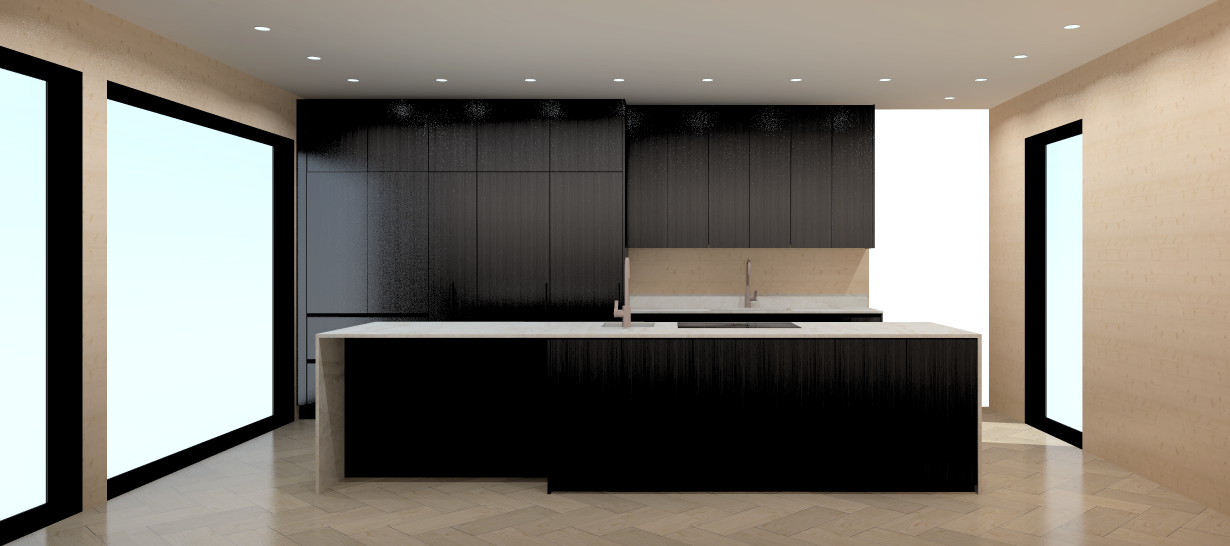 add a few island benches to the scene and make the scene in general more lively and realistic the scene lighting shall be late morning in mid may in helsinki the weather is clear and sunny with light clouds add also a nice front yard scene into the window