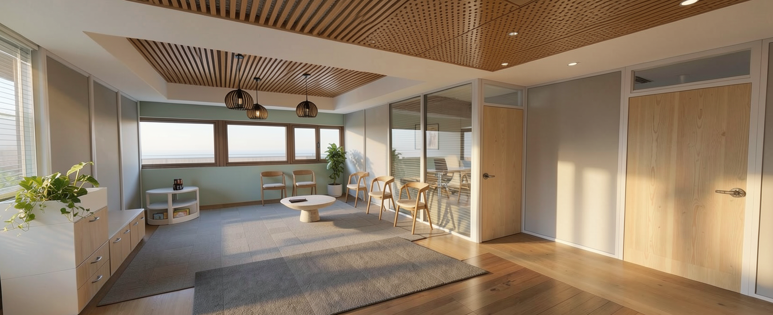 maintain geometry le faux plafond de la salle d attente est en lattes de bois parall le aux fen tres les menuiseries des fenetres sont noires les structures des cloisons mobiles sont blanches les diff rents sols sont tous au m me niveau