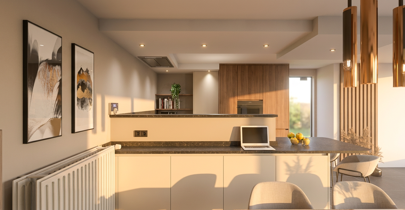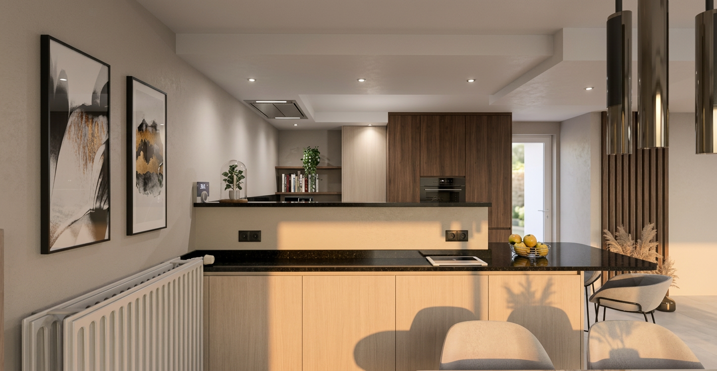 modern kitchen interior design minimalist style warm and cozy atmosphere neutral cream walls with soft lighting black and gold abstract art on the walls dark gray countertops with a sleek finish wooden cabinetry with a light walnut tone pendant lights in dark bronze hanging above white baseboards and a radiator with soft neutral tones elegant chairs with light fabric add natural light streaming through the window casting gentle shadows bowl with bright yellow lemons on the counter potted plant with lush green leaves on the shelf adding a touch of nature
