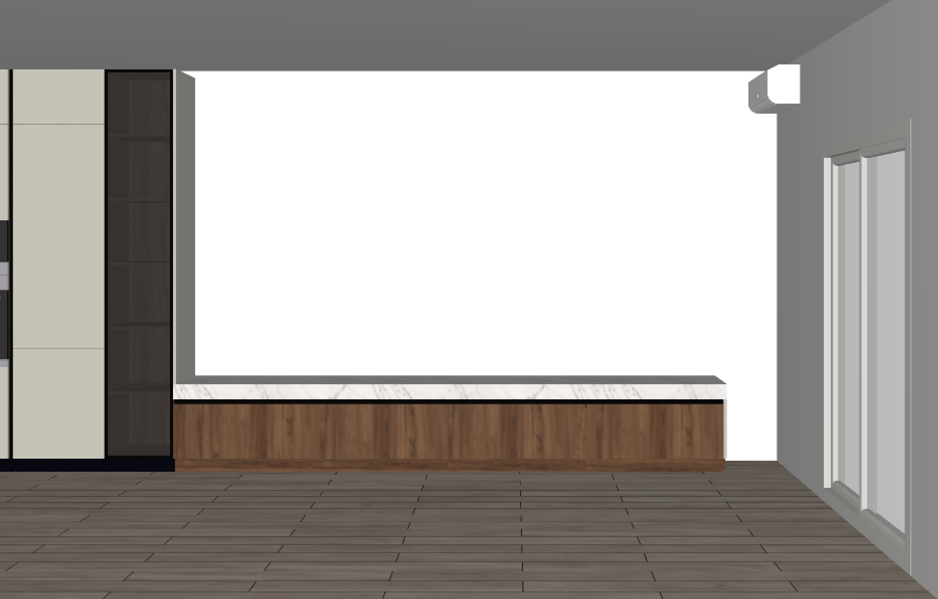 this design is for a tv furniture piece you need to place a large tv in the tall cabinet with the showcase i would like a vertical led light and some decorative items inside and on the wall of the tv put something that matches the countertop above the drawers keep the colors as they are do not change anything