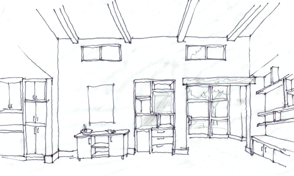great room with oversized stone tile floor picture over blue bufffet table modern cubist built ins and beams made of natural wood kitchen cabinets grey