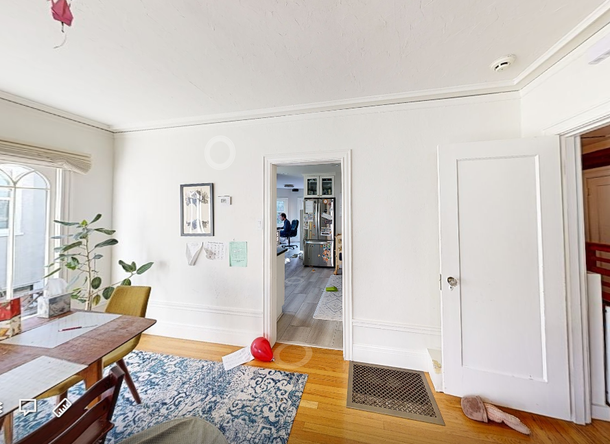 open left section of wall showing a kitchen to the other side leave the a half wall separating dining from kitchen