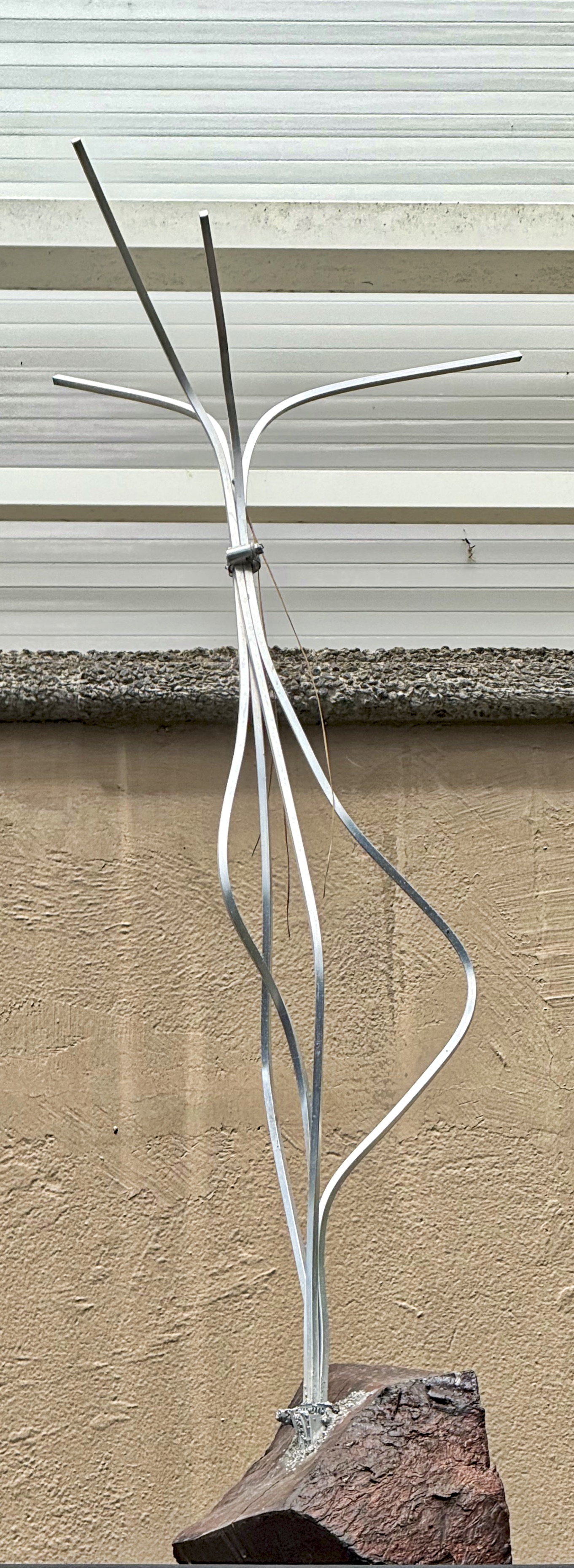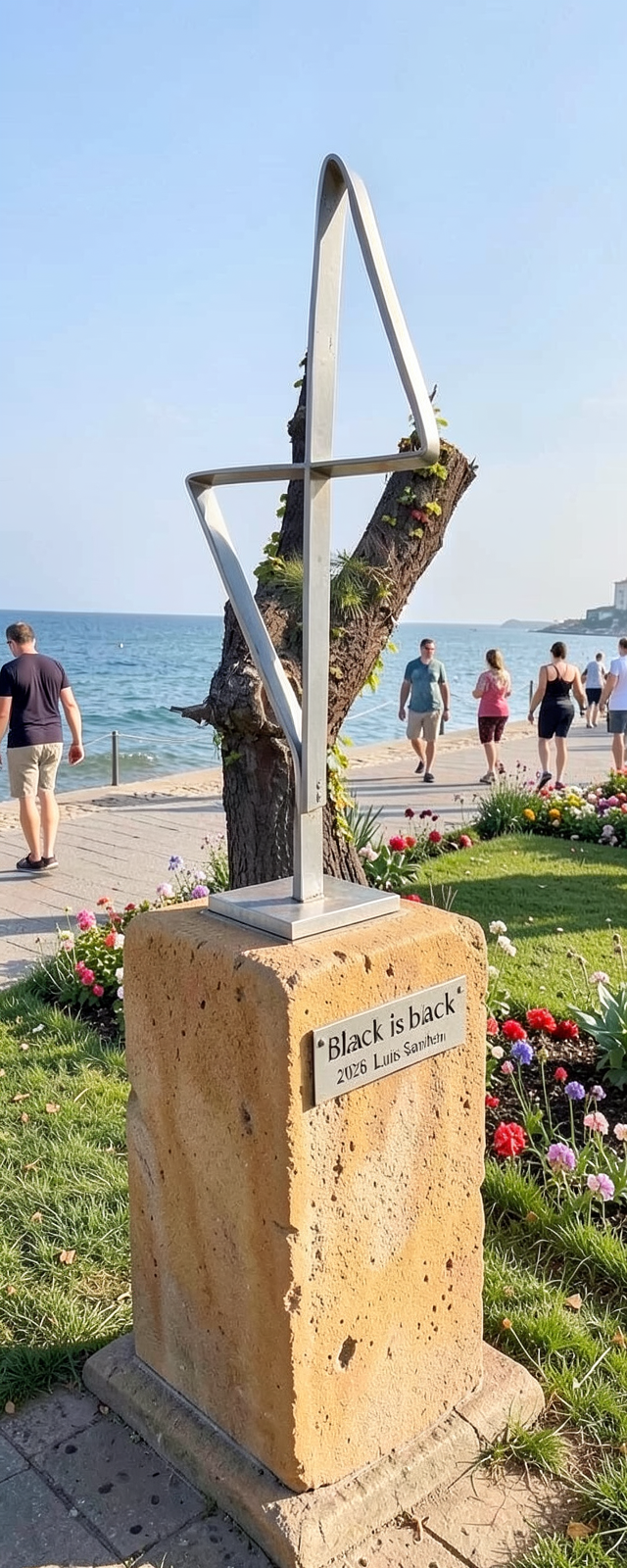 place the sculpture on a pedestal of translucent green glass prism and a plaque that says black is black 2026 luis s nchez on a seafront promenade with people strolling and a garden with flowers and grass around the statue