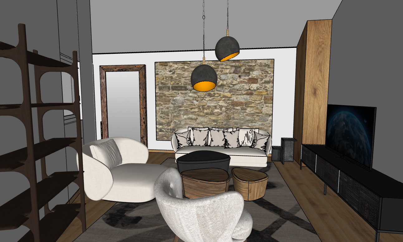 ilumina el contorno del muro de piedra con luz calida coloca una cortina clara en la ventana que vaya de piso a techo con un movimiento y caida natural no agregues elementos que no se muestran en la imagen original