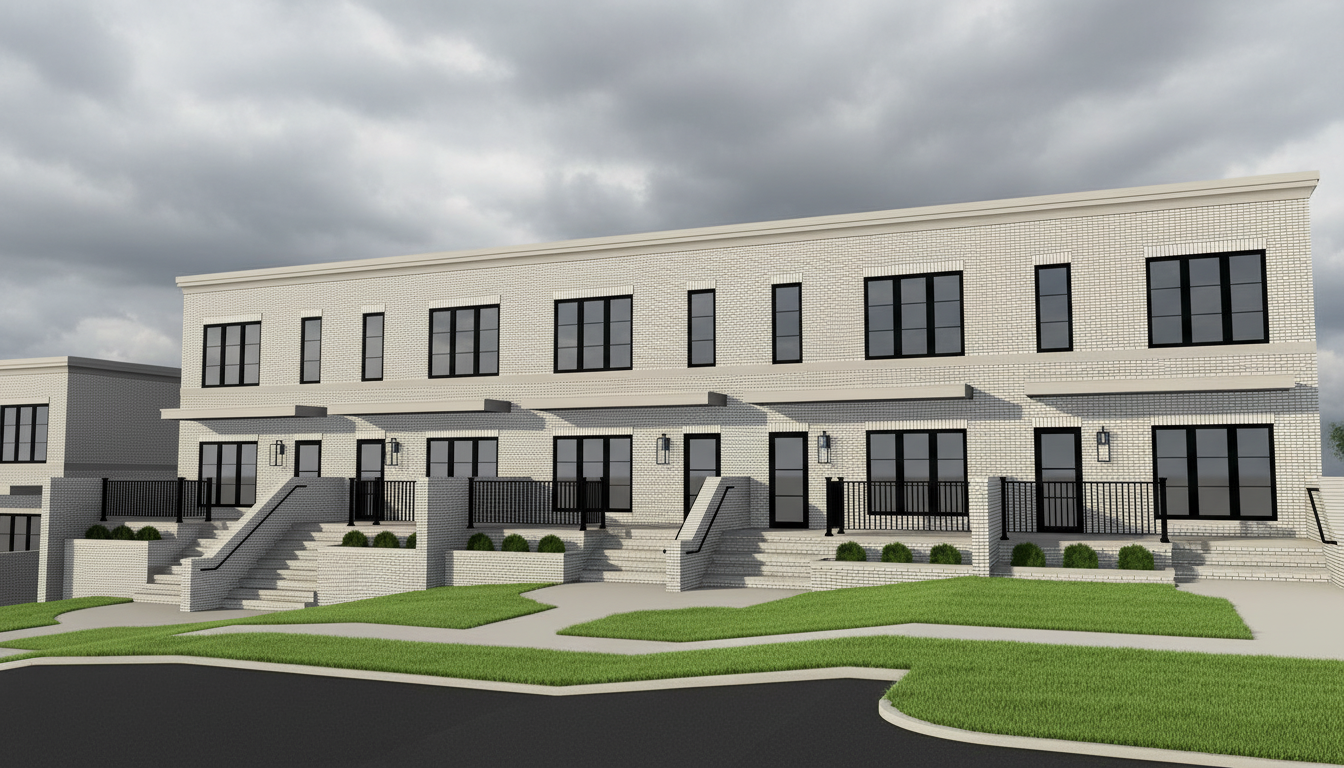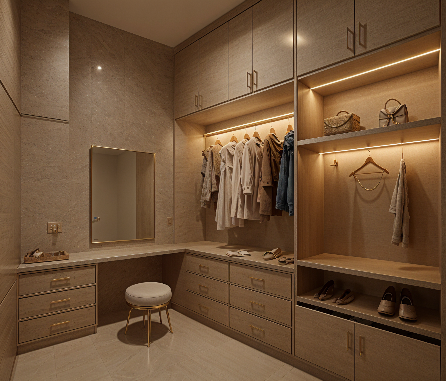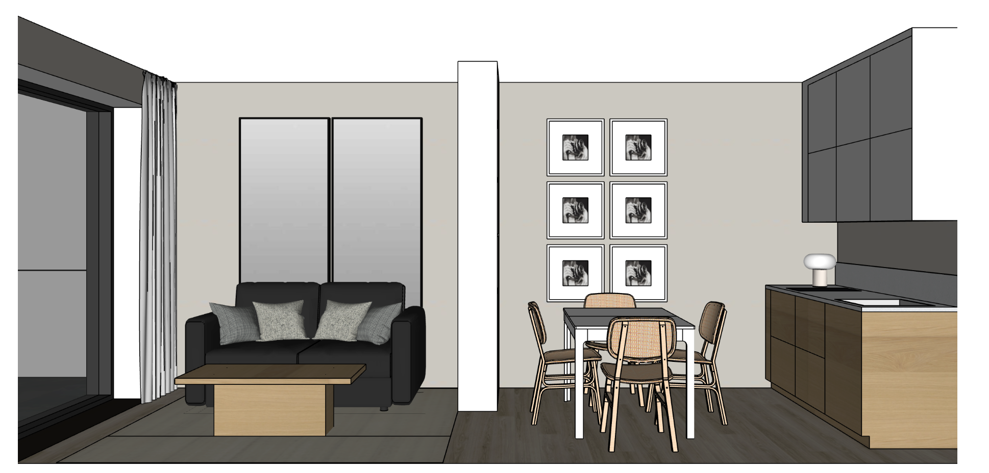 light and airy studio apartment separated by a bookshelf with minimalist kitchen