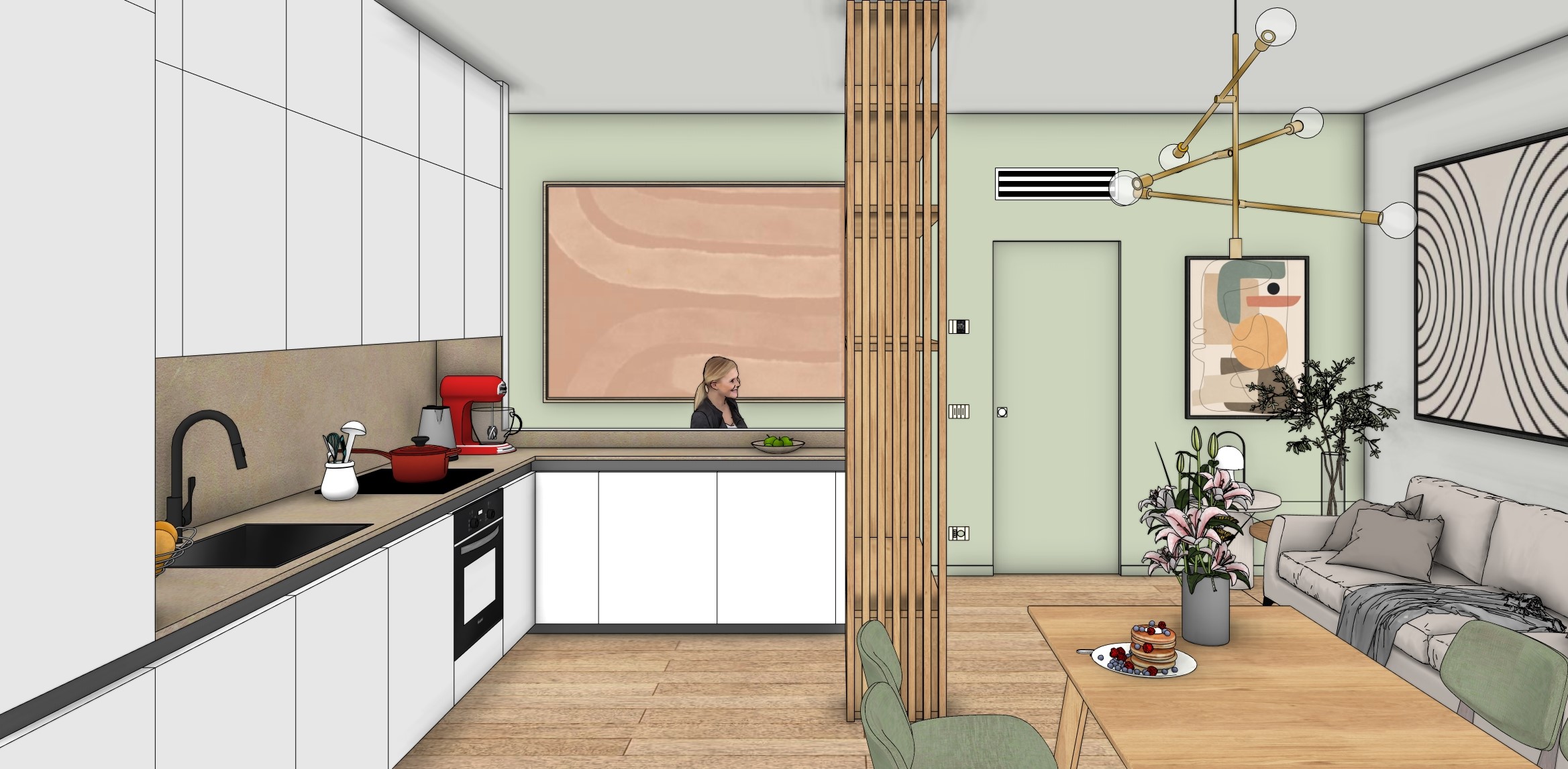 kischen top and splashback on the left are in sand color limestone green wall in the background is plain color not textured lights on