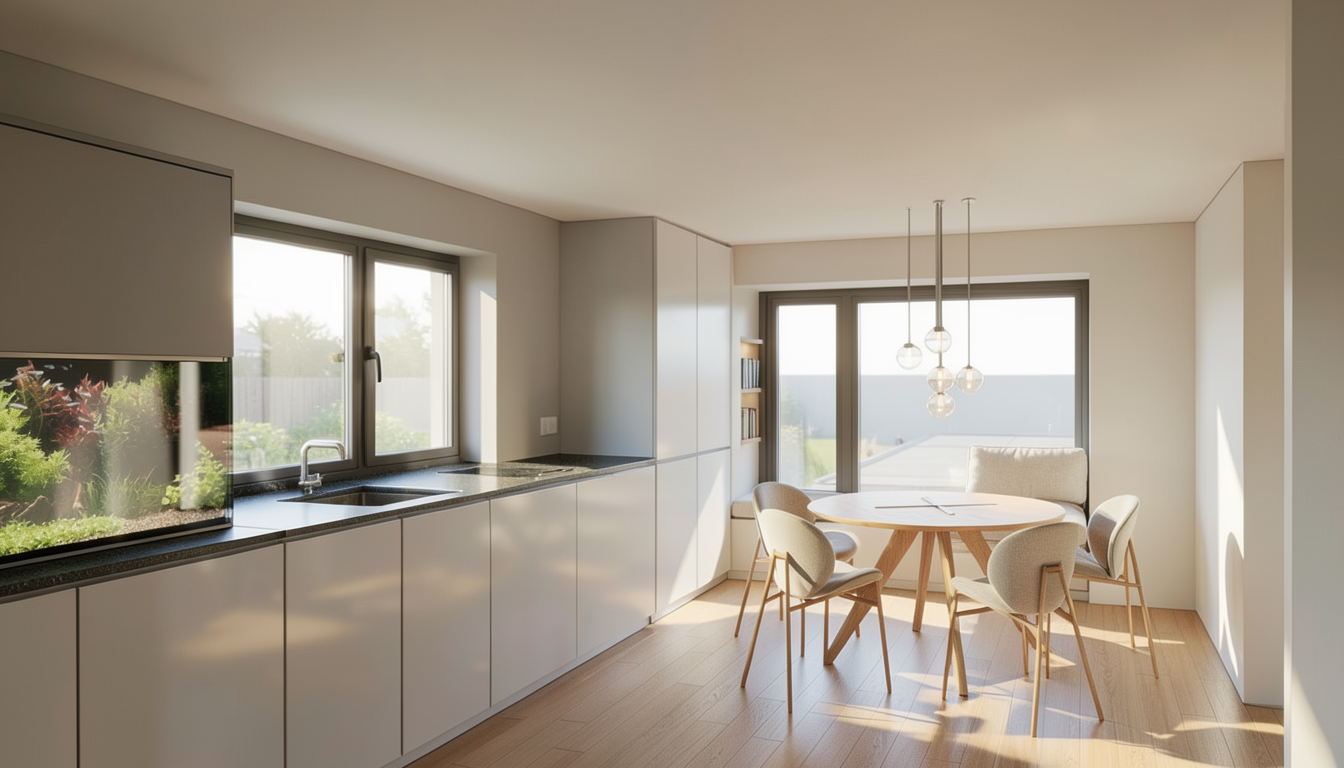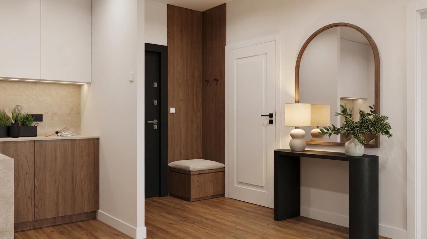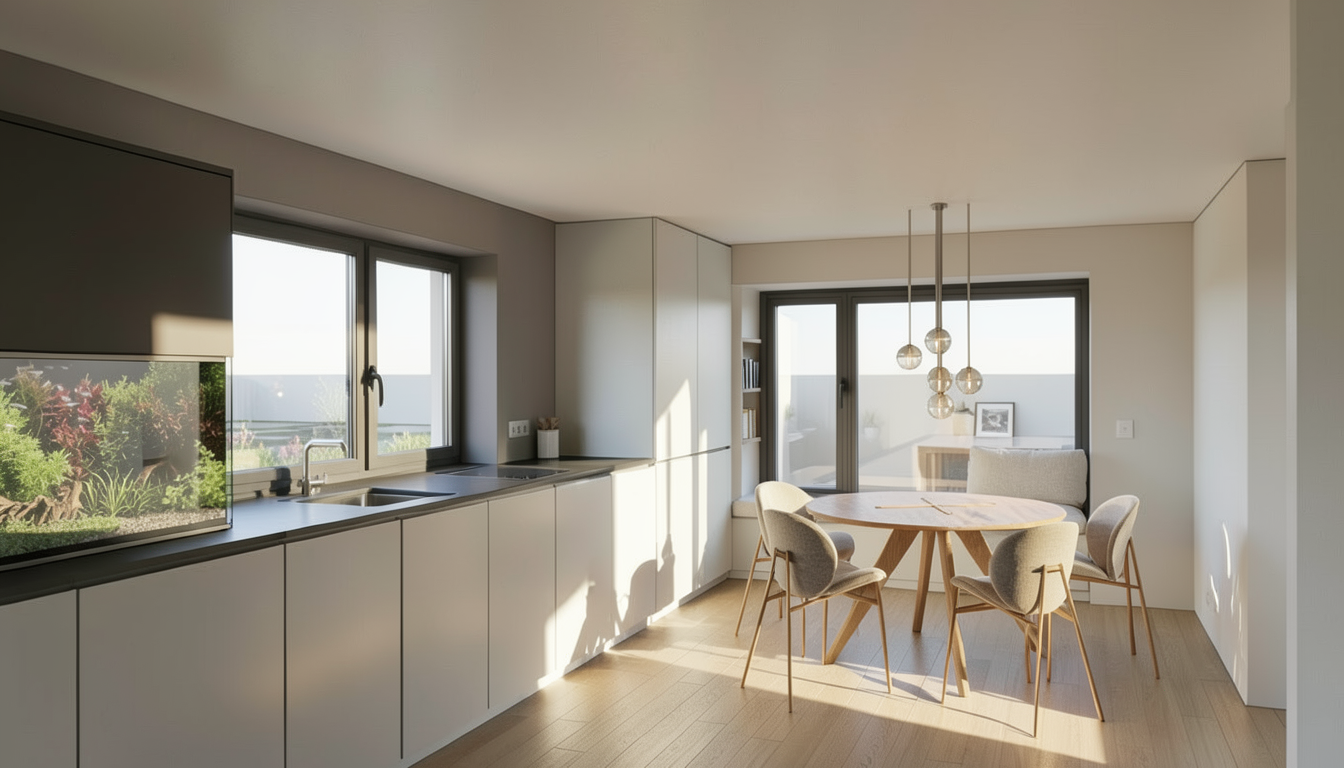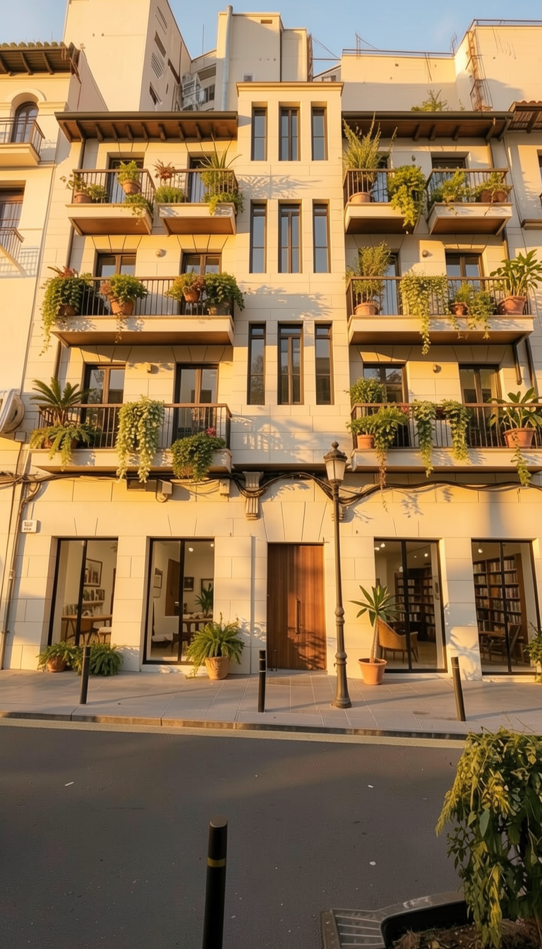 modern exterior shot white walls and with 8 dark grey awings in each balcony and 4 parking with cars at the ground level inside the building architecture