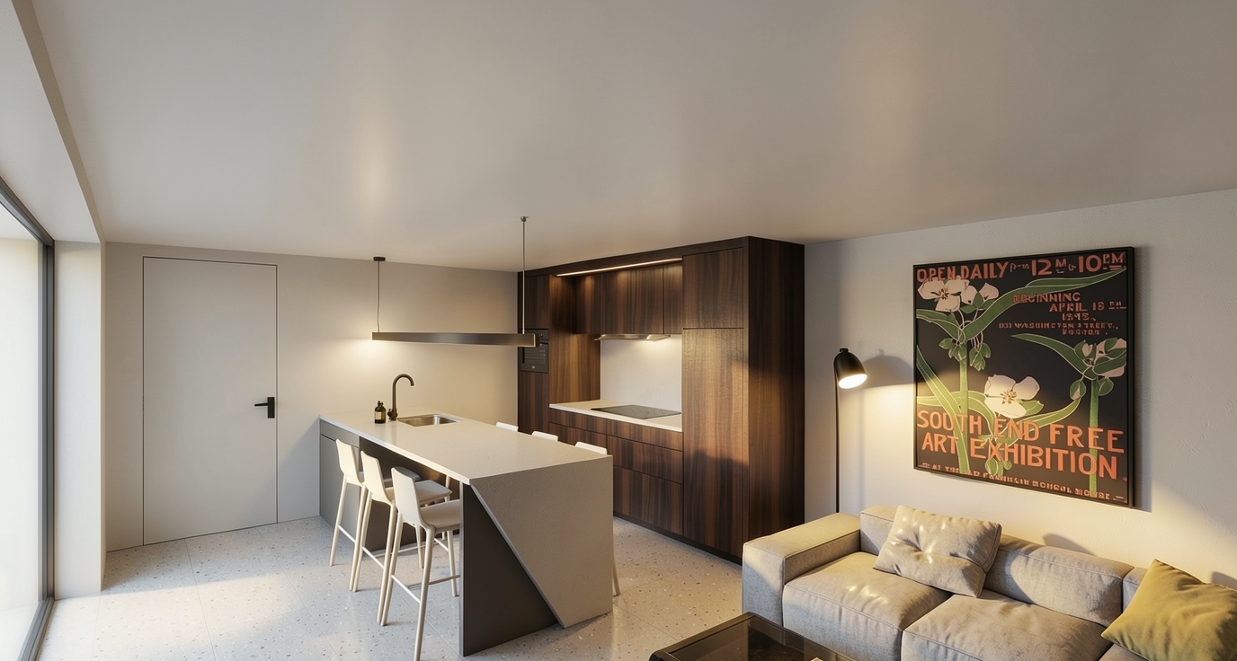 preserve original geometry keep layout unchanged no redesign no new furniture enhance only lighting and materials follow the drawing exactly preserve all wall positions and room proportions exactly no modification to design and materials do not change design do not change colors do not change materials do not change furniture do not change proportions enhance lighting day light enhance shadow add beige 2 throw pillows on bay window on the left