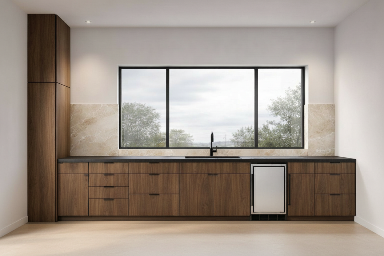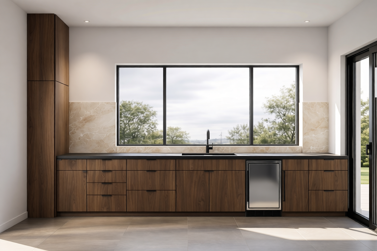 create high resolution photo with plush trees and bushes with vibrant sky create a country french blue shutters with alabaster white lap siding and brick shown a french country blend