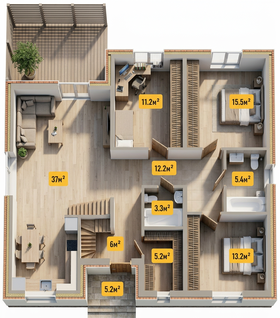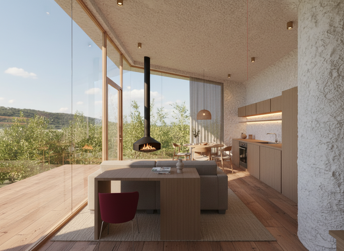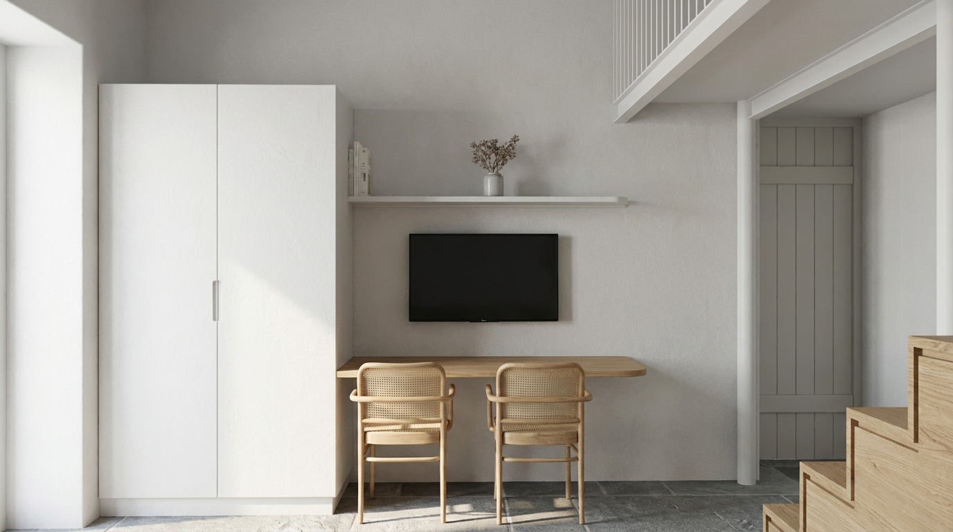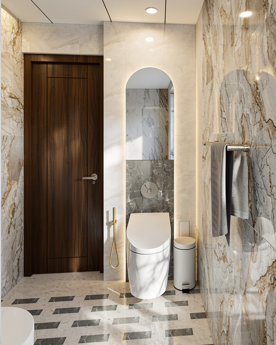 photorealistic interior render based on the original scene composition unchanged layout and camera matte wave effect porcelain surface integrated in the design floors and walls in polished concrete with subtle tonal variation and realistic texture marble table with natural veining refined and non glossy finish poufs upholstered in dense texture fabric in a matching tone soft but structured appearance blue vinyl rug with textile effect slightly matte realistic fibers simulation lighting combines soft natural daylight with carefully designed interior lighting creating a poetic atmospheric mood with gentle contrasts and depth add a receptionist behind a computer naturally integrated into the space realistic posture and subtle movement physically accurate materials pbr no plastic look no artificial shine editorial architectural style take care with the space and profundity of the stairs