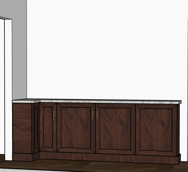 this is a beautiful walk in closet for a master bedroom the cabinets are made of a natural stained knotty walnut the cabinets are all 12in deep with flush base trim along the bottom the floors are a beautiful hardwood and the countertops are white marble there are clothes hanger rods above the countertops the door to the left is a standard interior door