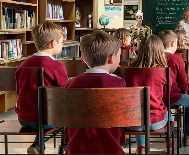 change the first kid face sitting with his back facing forward in front chair 10 years old wearing a red sweater uniform