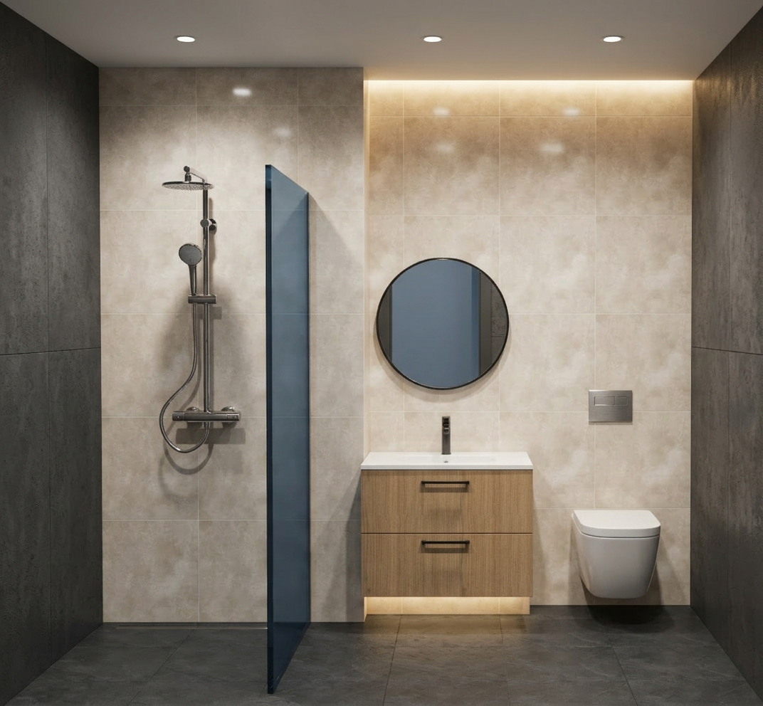 beige tiles wall and flor no led
